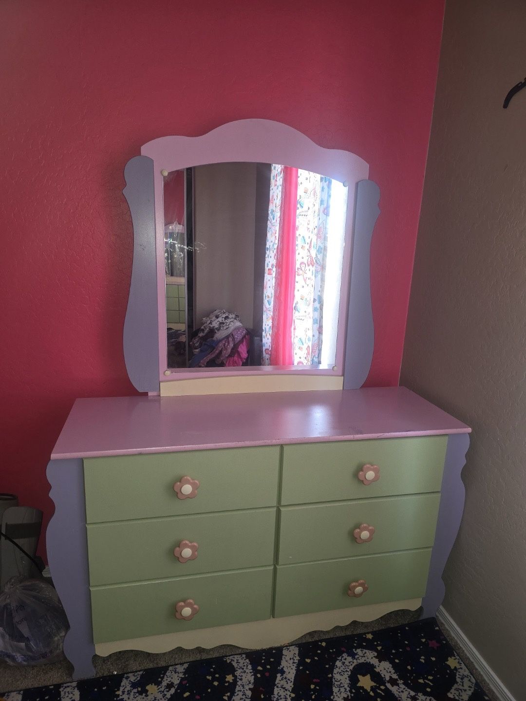 Charming pastel dresser featuring a soft pink top, mint green drawers, and lavender side accents for a playful, whimsical look. The six spacious drawers are adorned with flower-shaped knobs, adding a sweet, cottage-style touch. Topped with a matching framed mirror with gently curved edges, this piece is perfect for a child’s room, nursery, or anyone who loves colorful, retro-inspired furniture. Both functional and decorative, it brings personality and warmth to any space.