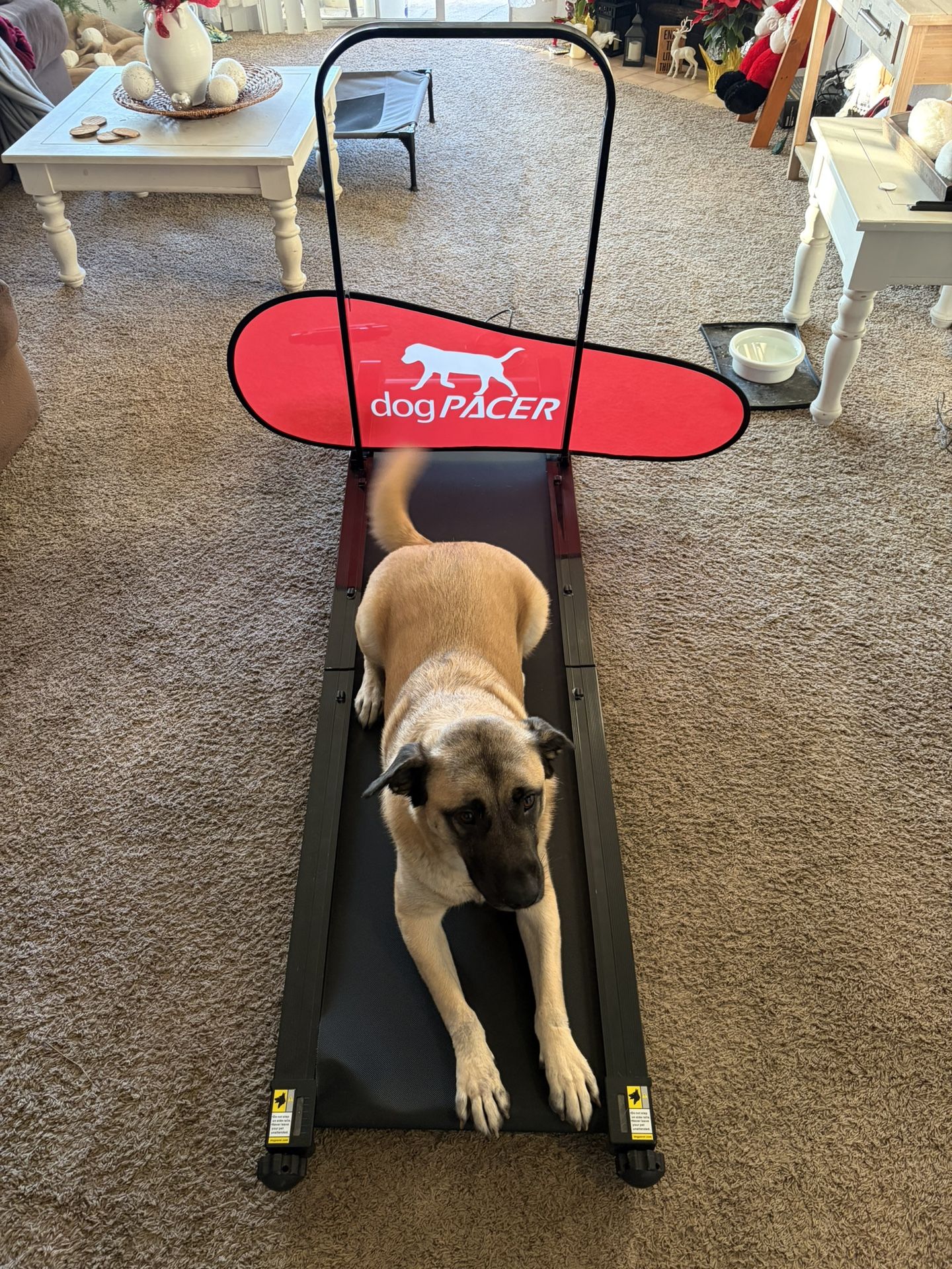 Used a couple times then put away. Dog in photo is 80lbs and a little bigger than medium size. It can hold dogs from 1 to 179lbs and it has patented folding technology