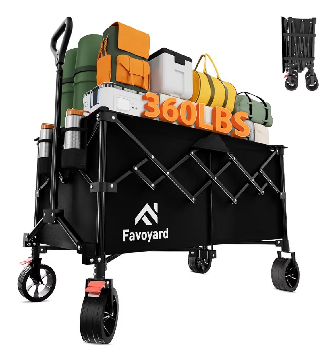 2 available. $50 each, $90 for both. Brand new, unopened boxes. Heavy duty, 220 L, 360 lbs capacity. Big wheels with brakes, folds easily. Perfect for beach, camping, garden, or groceries. Pickup in Hollywood.