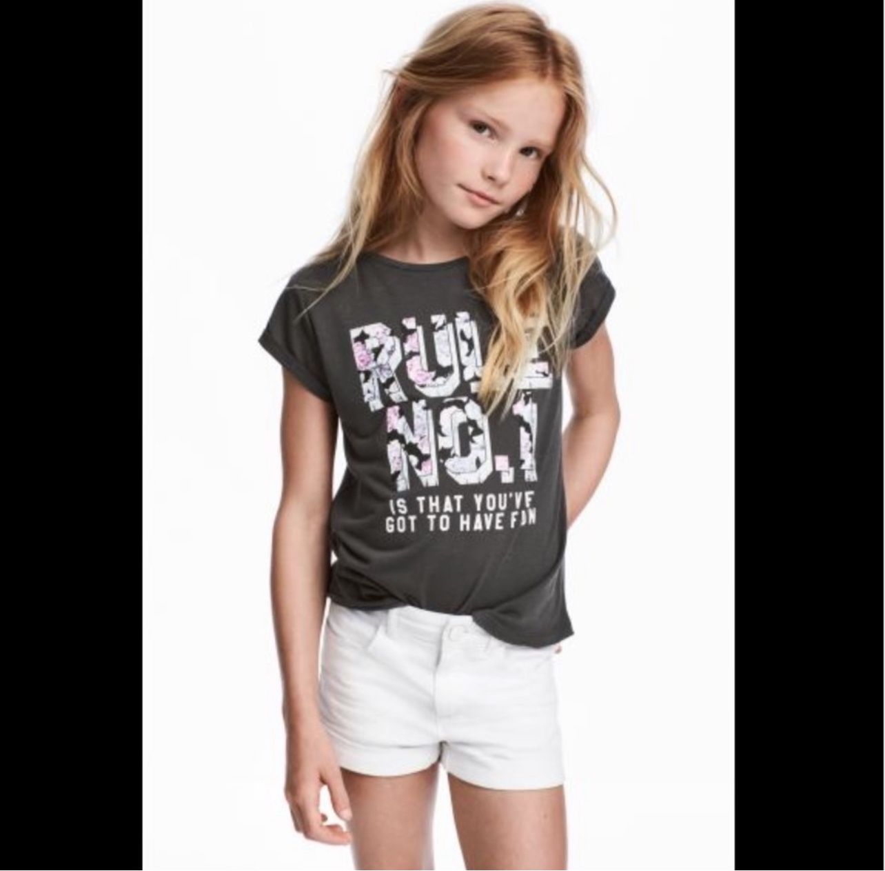 NWT✨ H&M Girls Printed Jersey Top Very cute & perfect for anyone Flirty, flowy, comfortable, top in soft Jersey with print motif “Rule No.1 is that you’ve got to have fun” on the front center, short sleeves with sewn-in turn-ups a raw edge hem. Size 14 Youth Dark Gray Polyester/ rayon Bundle to save💰like for special offers✅ Looking for new home🏡😊💗✨