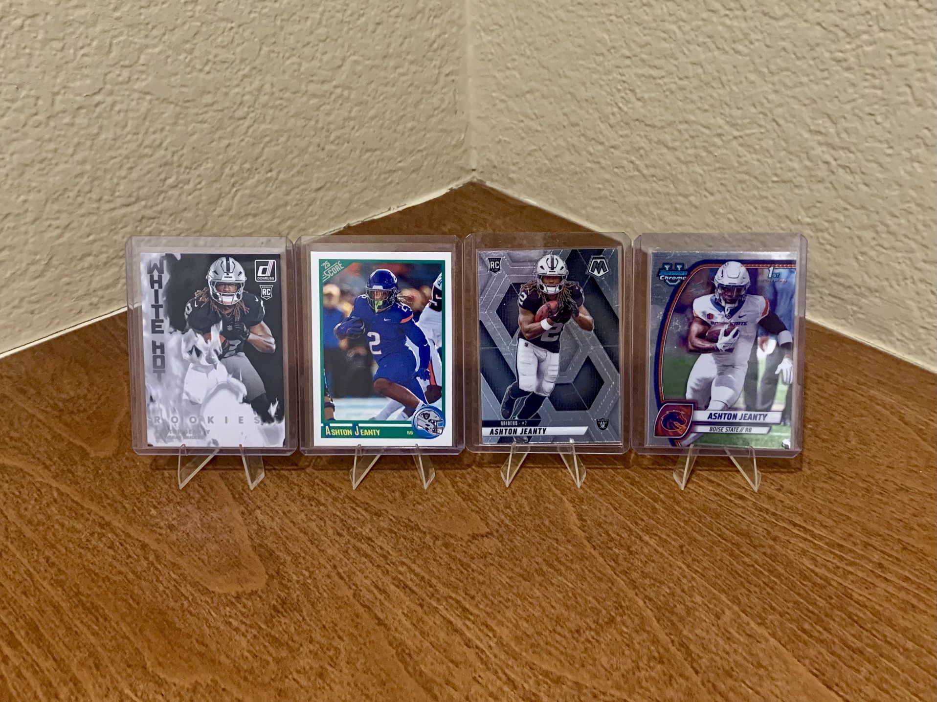 4 Ashton Jeanty Rookie Sports Cards. 3-2025 Donruss White Hot, Panini Score & Panini Mosaic Chrome. 2024 Topps Bowman U Chrome. Not graded, all in great shape! If interested in shipping, I’m also on fb marketplace (Andy Obregón)