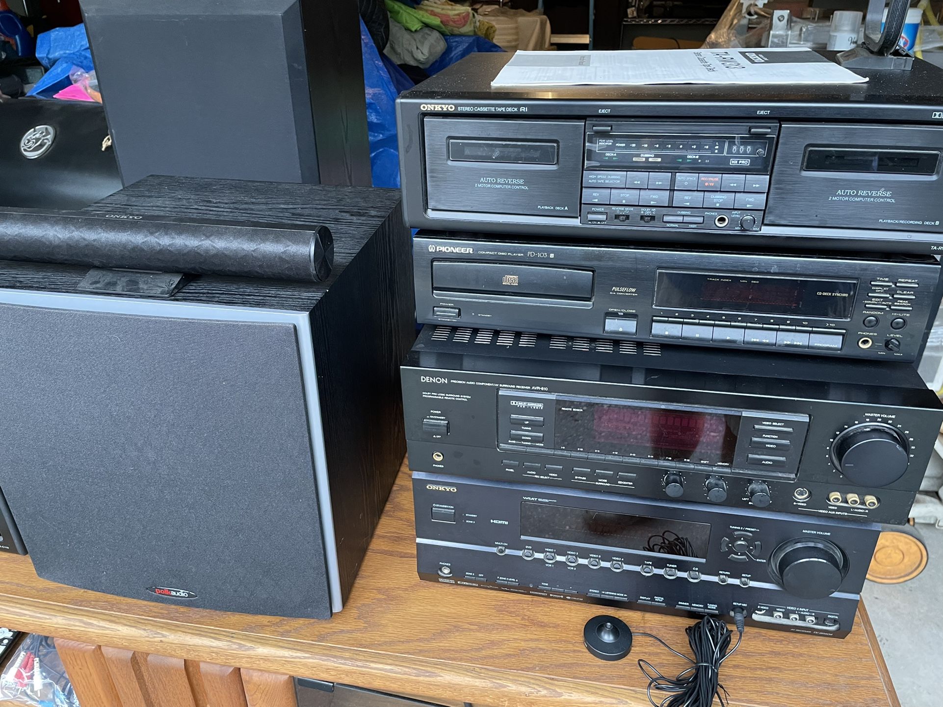 Onkyo TX-SR604 $125 Denon AVR-810 $100 Onyko TA-RW313 $100 Pioneer PD-103 $75 Onyko D-077C $60 Polk PSW10 $125 Acoustic Response 707 Floor Speakers (2) $100 Would like to sell as a package. Individual prices are also noted. Original owner and all in working condition.