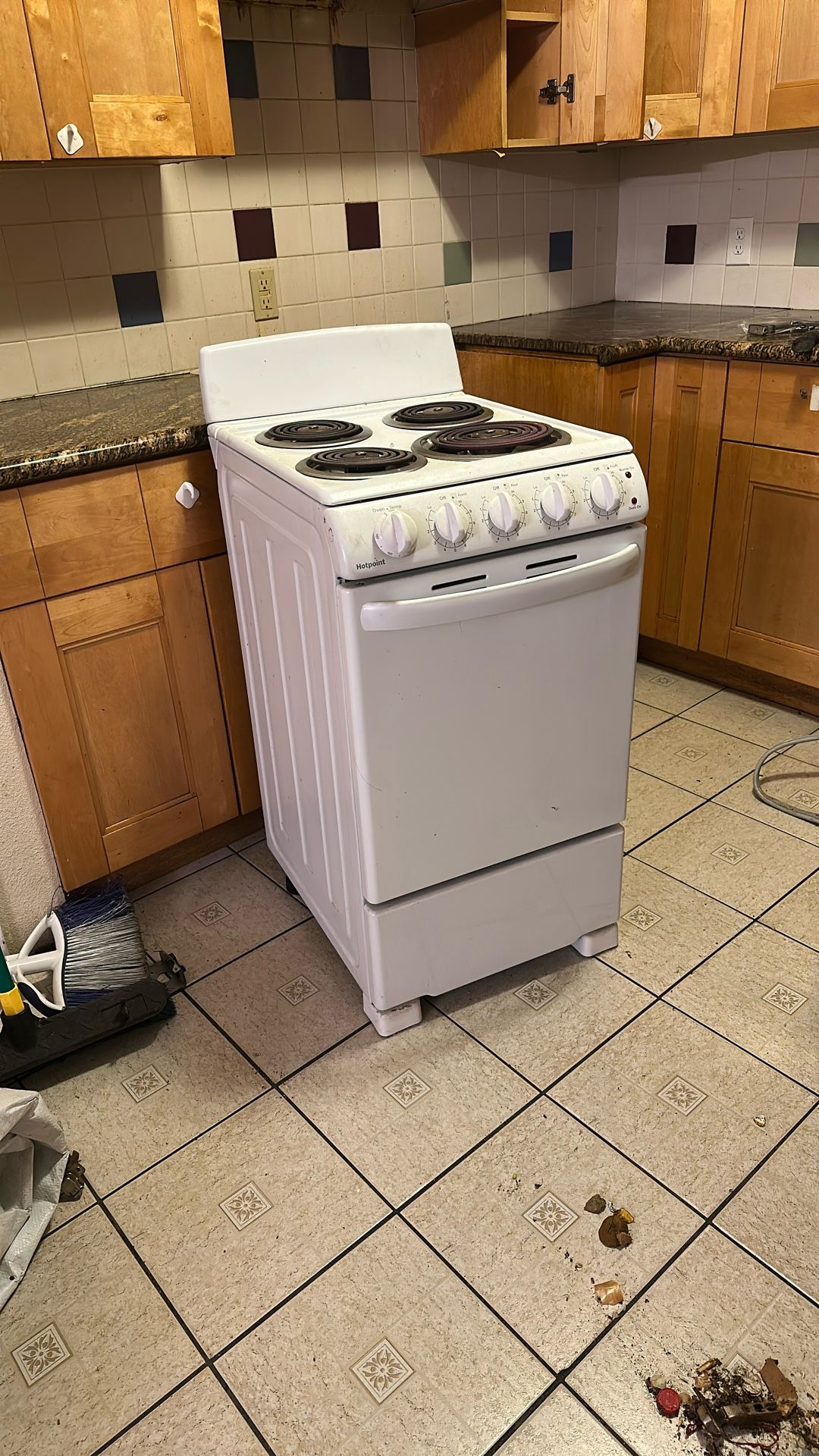 Small electric stove works great it’s most likely used and old but works in condition. The stove heats up very quick and very hot great for a small kitchen or a backup stove. (pick up only)