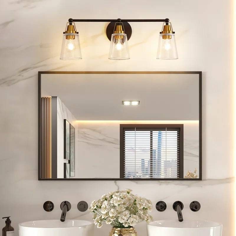 3-Light Vanity Fixture – $499 new, asking $300 • Black/brass finish with clear glass shades • Wet location rated (bathroom safe) • Stylish for master