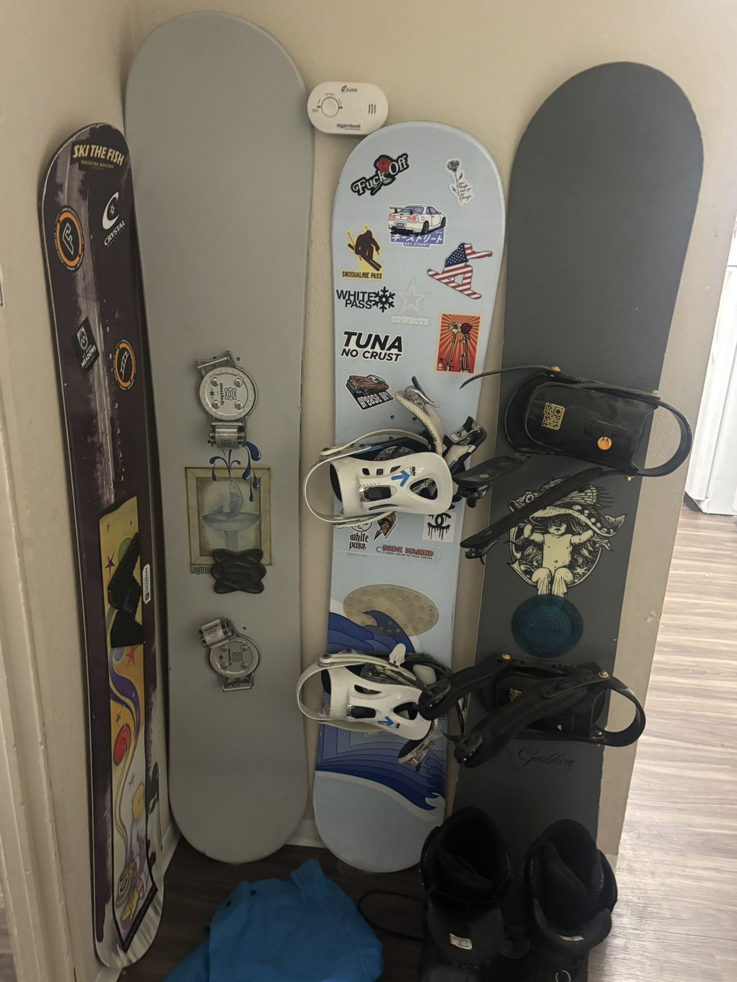 Here’s the description 4 snowboards 3 with bindings one has the slip on bindings the others have regular style. Comes with black size 8 women’s boots and blue size M Columbia women’s pants and a black size M pair of pants. Willing to separate.