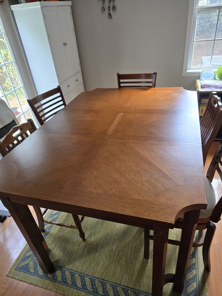 Large high counter dinning table and chairs set. Wood is good condition with few minor scratches on table. 4 Chairs swivel and in great condition with one chair needing TLC, back support to be rescrewed for support... Buyer to Pick up locally, SOLD AS IS, Cash only.