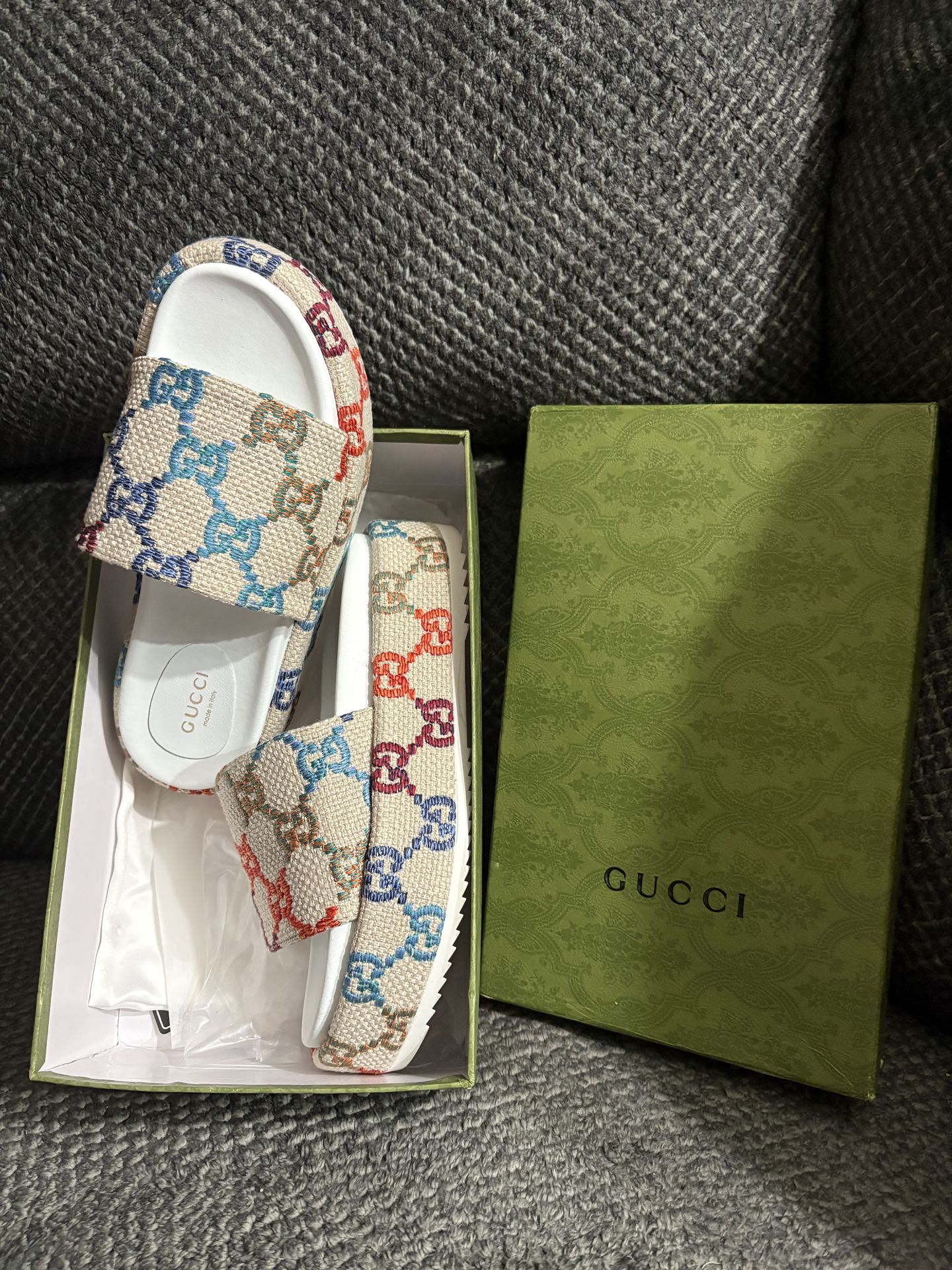 Almost brand new rainbow platform Gucci slides still with original box. Size 40 EU/ 10 US women’s and super comfy, just not quite my size 😭. Really need to sell these ASAP so please let me know if you’re interested!