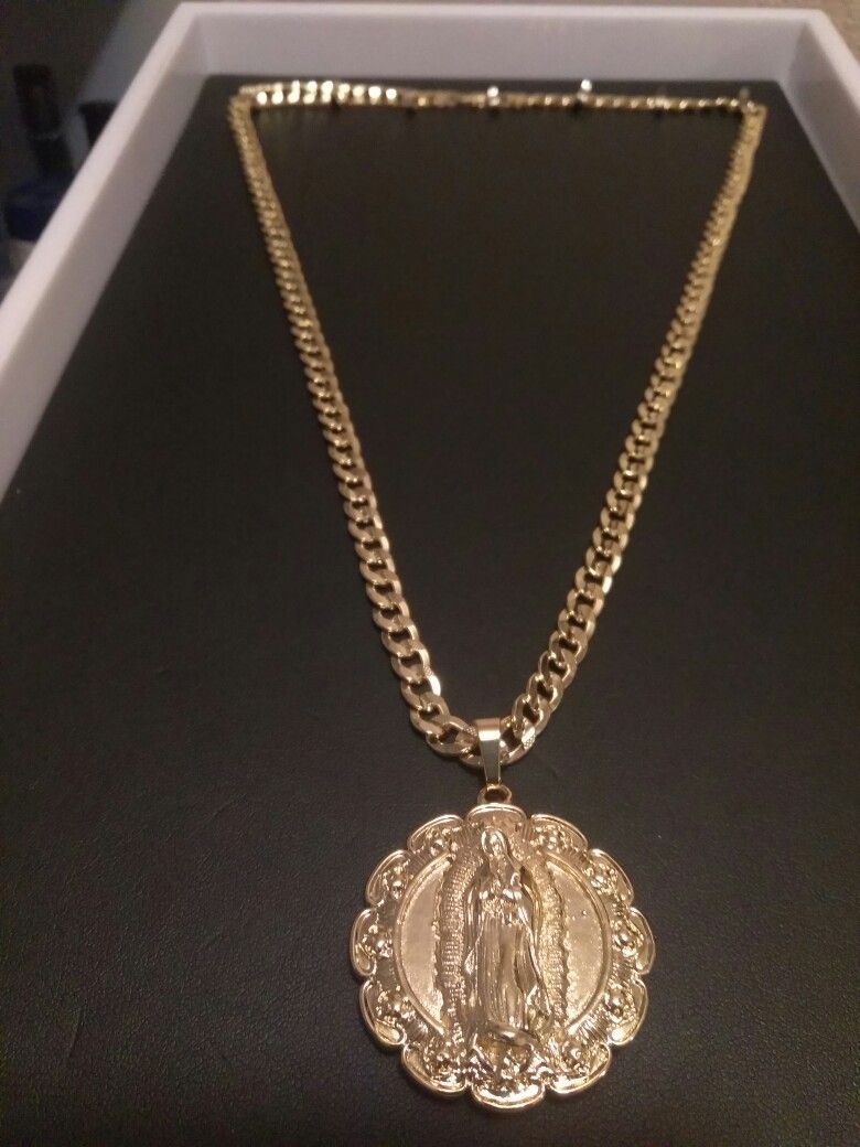 Cadena estilo cubana de 26" con Medalla 2" Es de Oro laminado y es nueva. Gold filled Cuban link chain with Medallion. The chain is 26" long 5mm & the charm 2". Both are brand new & gold filled not plated. Good quality jewelry that has the same beauty as Solid gold Jewelry for a affordable price.