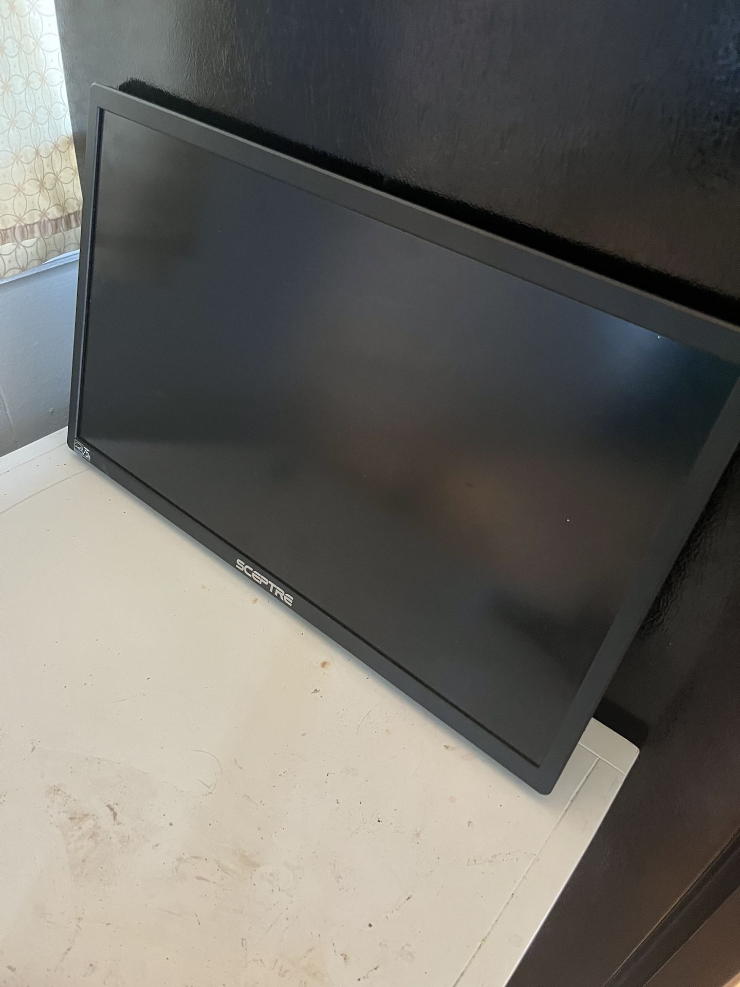 2 - 22” Sceptre Monitors 1 has a 3/4” scratch which does not effect NB Dual Monitor Arm - Full motion swivel arms which mounts to a desk or table.