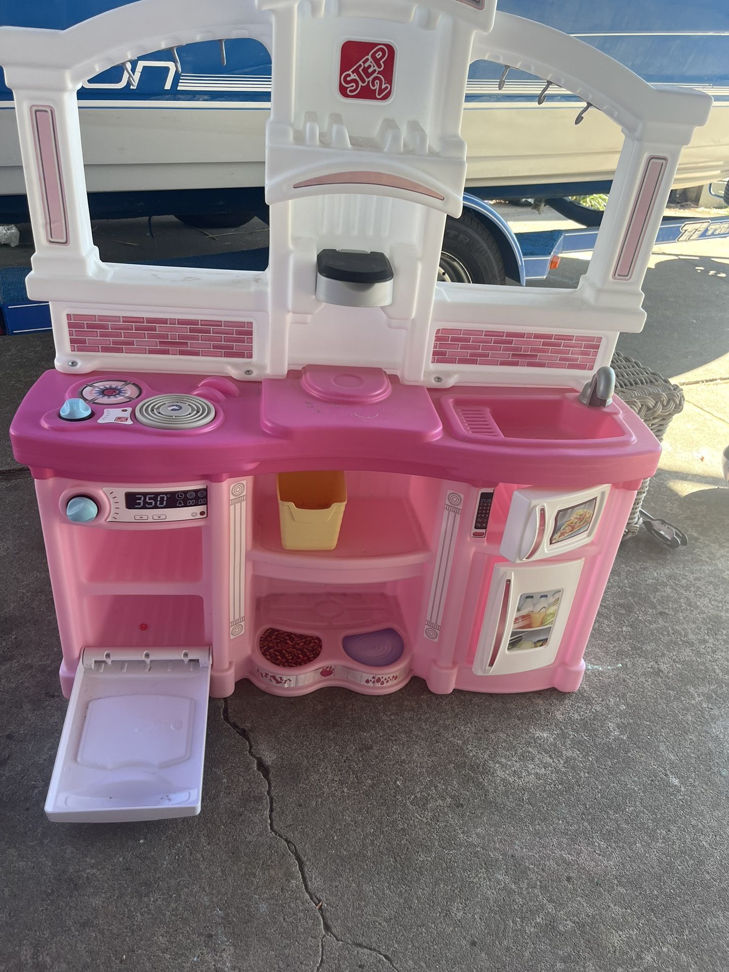 Pink kitchen! Barely used. Like new condition. You will also get the basket of random food/utensils as well as the Melissa and Doug drink dispenser. Non smoking home