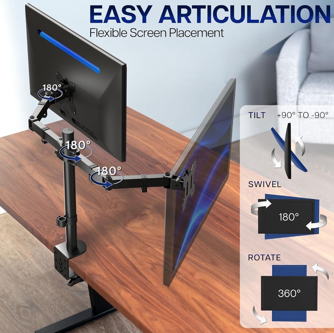 Dual Monitor Mount for 2 Monitors Computer monitor mount Dual monitor mount each arm can holds 2 monitors up to 30 inches, maximum load capacity 22 lbs, compatible screen backside VESA mounting holes 75x75mm or 100x100mm. Flexible Adjustment: The dual monitor arm has a healthy range of adjustment that includes 16.73 inches of height adjustable, 45 degrees of tilt, 360 degrees of rotation, and 180 degrees of swivel. Various adjustment functions help placing your monitors to the position that fits you optimal. Work in ergonomic comfort. Heavy Steel Fabrication: The dual monitor mount has excellnet sturdiness and stability because it is made of toughened steel, each monitor arm holds up to 22 lbs. One can also tighten or loosen each joint of the dual monitor mount to make movement tight or lose without fear of droppingy over