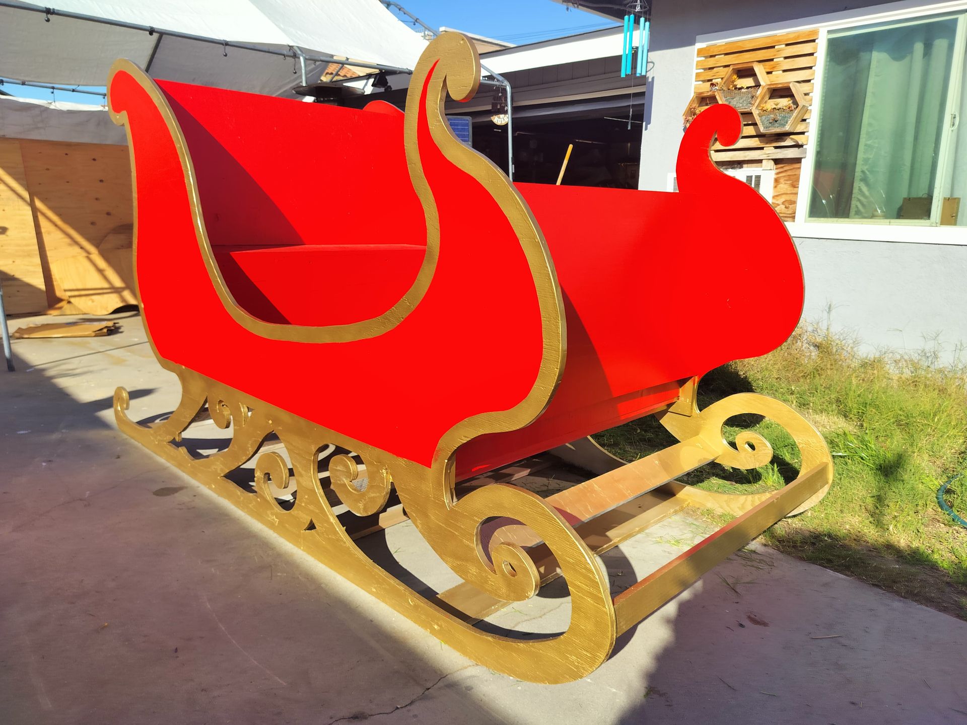 Huge Santa Sleigh Dimensions are: 5' tall 9' long 4' wide Made out of 3/4" good quality plywood, very heavy. It can carry two adults or so.
