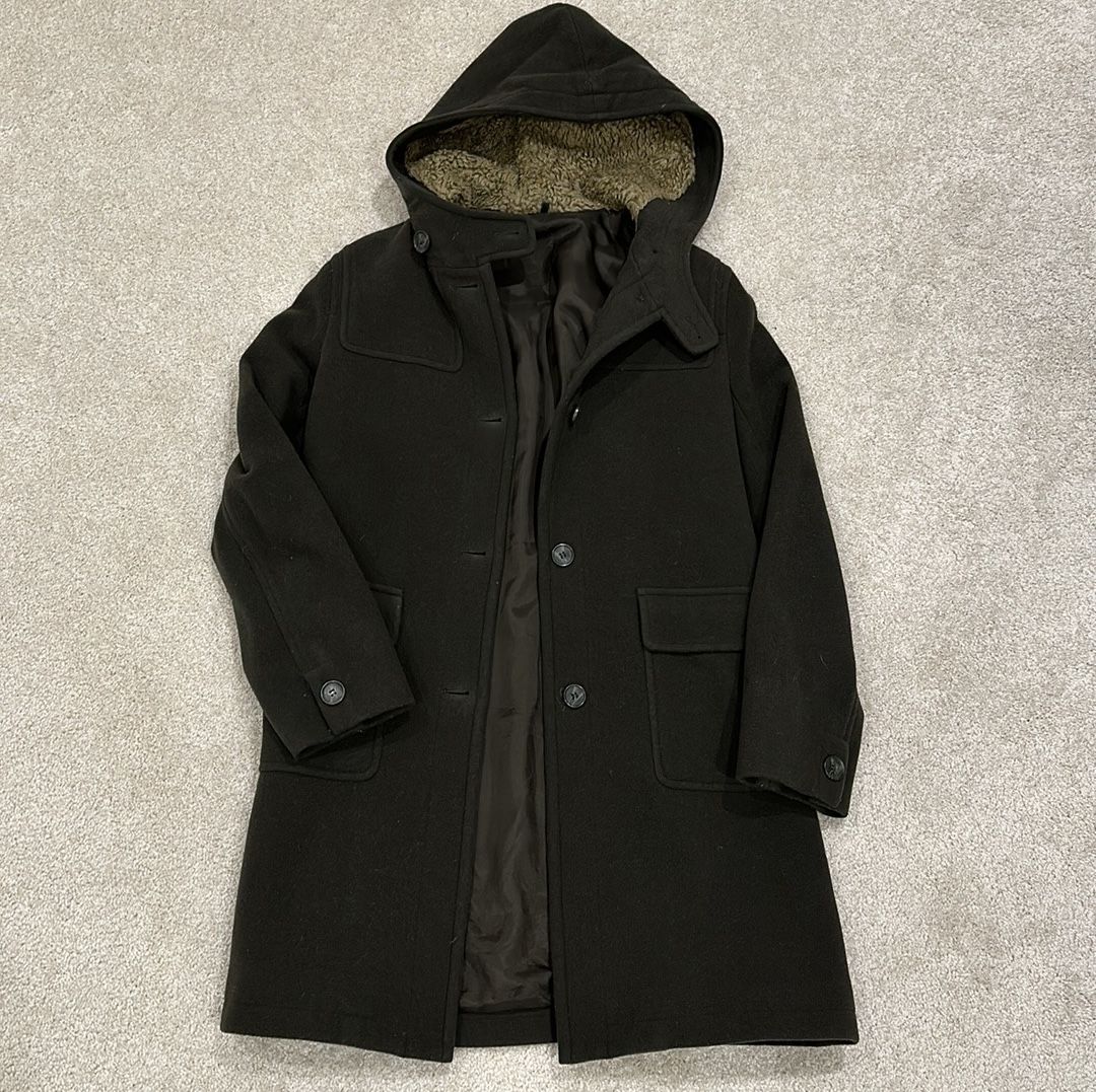 Great wool coat for the fall or spring. Olive green color with attached hood and two front pockets. Button closure in front. One button missing at the collar. Some pilling and needs a good lint roll but otherwise in good condition. Generic brand called Veeko. Size 36 which is around a small.