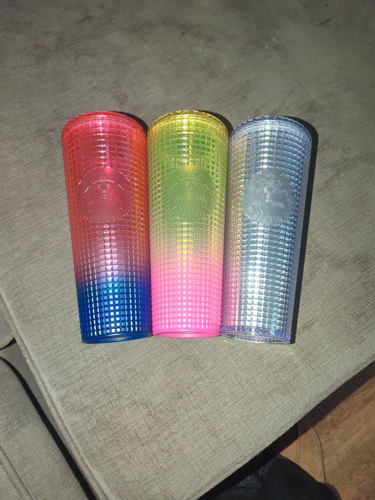 Brand new Starbucks 24 oz tumblers. Set of three one is pink with purple. Another one is yellow with pink and another one is crystal clear all square design.