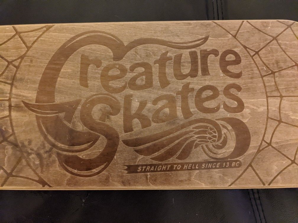 Rare Creature coffin skateboard deck, grip tape applied, never ridden, graphics are burned into wood and stained, not printed, very unique and discontinued, hung for display