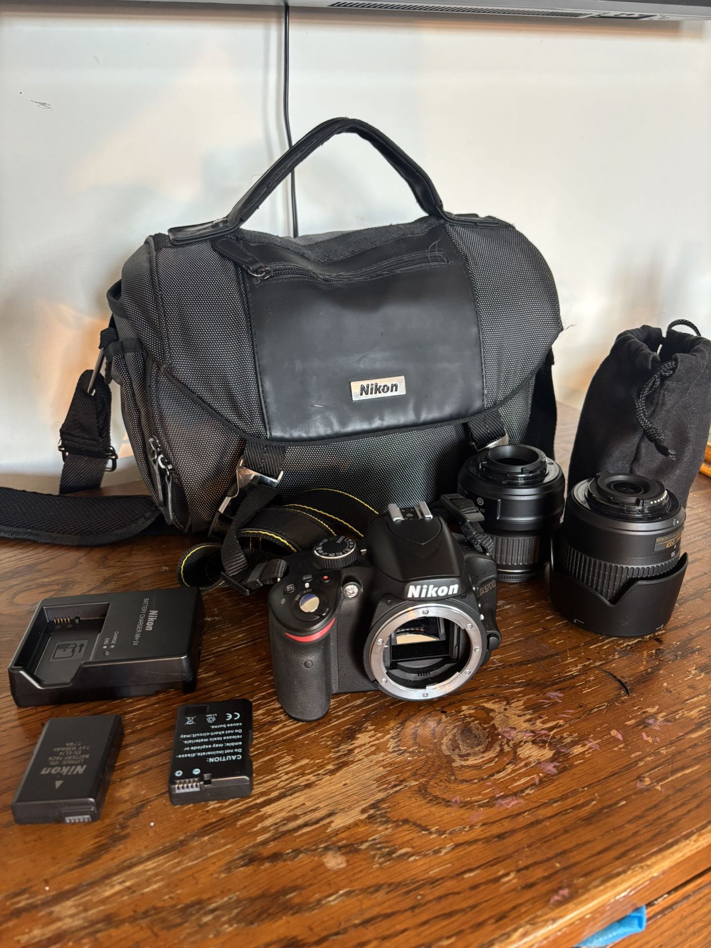 Nikon D3200 24MP DSLR. Comes with 2 kit lenses and lens hood. 18-55mm, 55-200mm. Can be 3 lenses I can throw in a 70-300mm for $20. Mini tripod and remote shutter. 2 batteries with charger. Camera bag included.