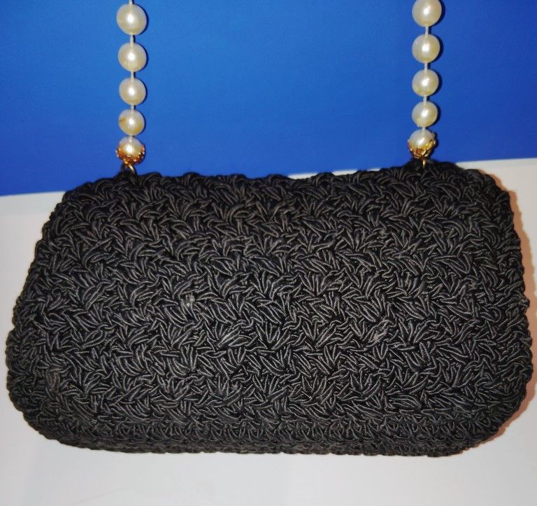 Vintage 80s Black Beaded Clutch Purse with a 28-inch Long Pearl exudes a classic elegance perfect for eveningwear. Crafted from beaded material, this