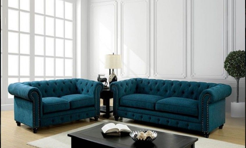 βπ« We do not have a showroom. We deliver directly from the manufacturer to your home π . π Delivery is only $40 π οΈ Assembly is an extra charge. Price on assembly depends on which item you order! π΅ We accept cash on delivery Mattresses are sold separately π₯We are voted #1 on offer up, please also view other options on our page!!! CM6269TL-SF Featuring button tufted cushions with nail head trim borders, this fabric sofa set offers a timeless design bound to fit any living room. Transitional Dark Teal Linen-like Fabric, Wood, Others Chesterfield-Inspired Rolled Arms Nailhead Trim Dimensions: Sofa 90"L X 38 1/2"W X 33"H Love Seat 67 1/4"L X 38 1/2"W X 33"H