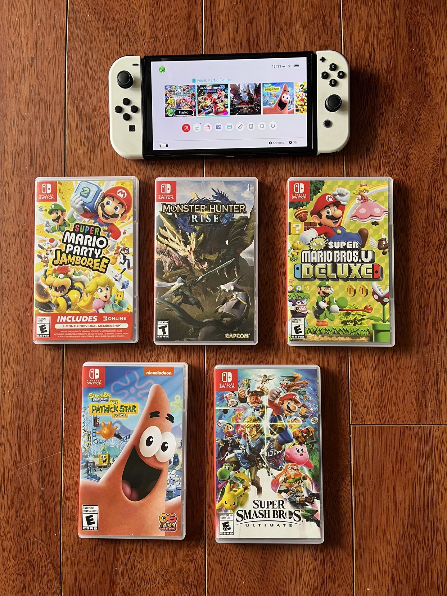 Nintendo switch OLED with mariokart installed $300 for everything pictured Comes with all cables and dock Game prices if interested in only games Mario party jamboree: $30 Monster hunter: $10 Mario bros Deluxe : $20 Patrick game: $10 Super smash: $30