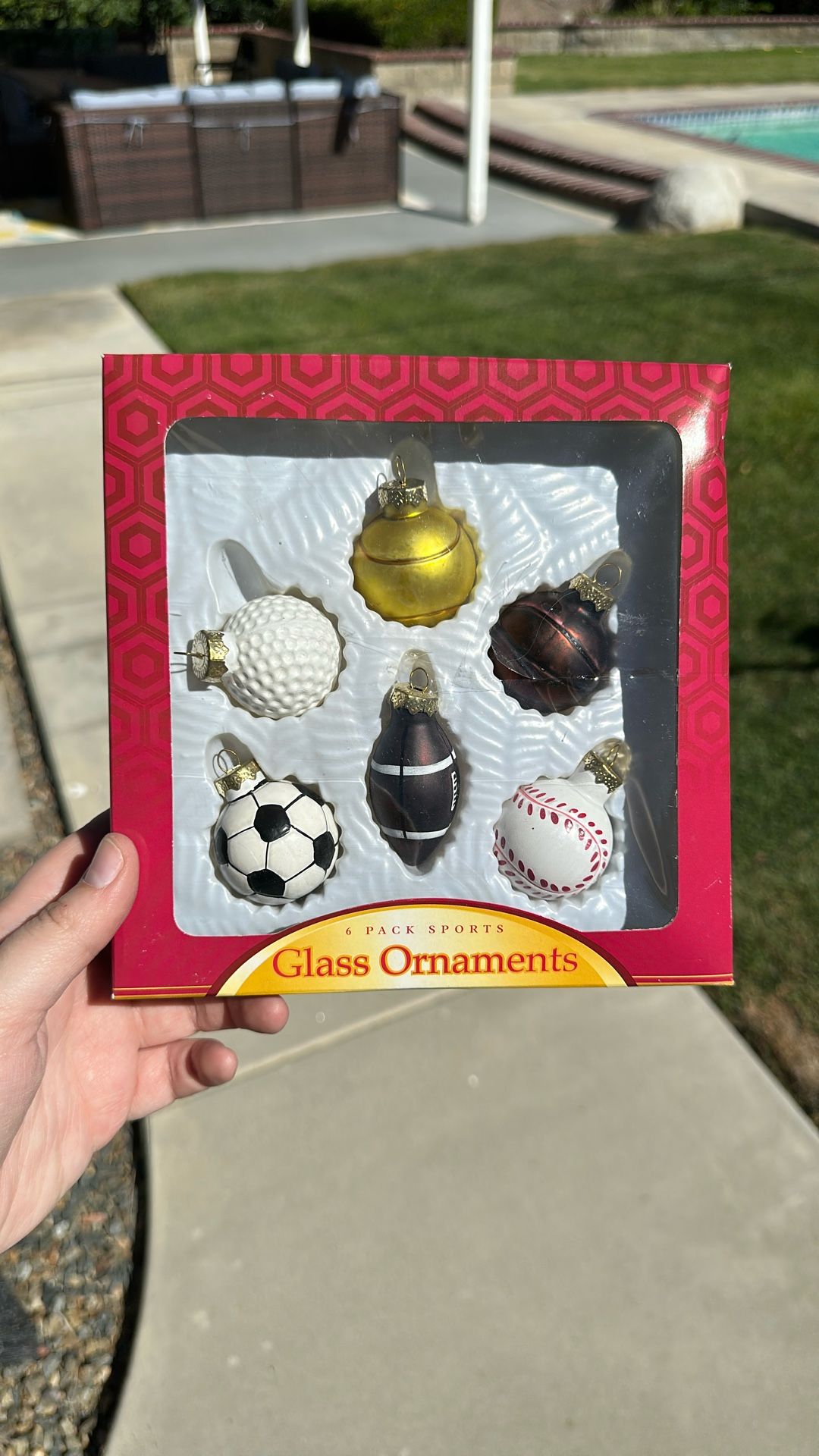 6 pack sports glass ornaments. they're all shaped like different sports balls. they're new in the box but the box is a bit beat up