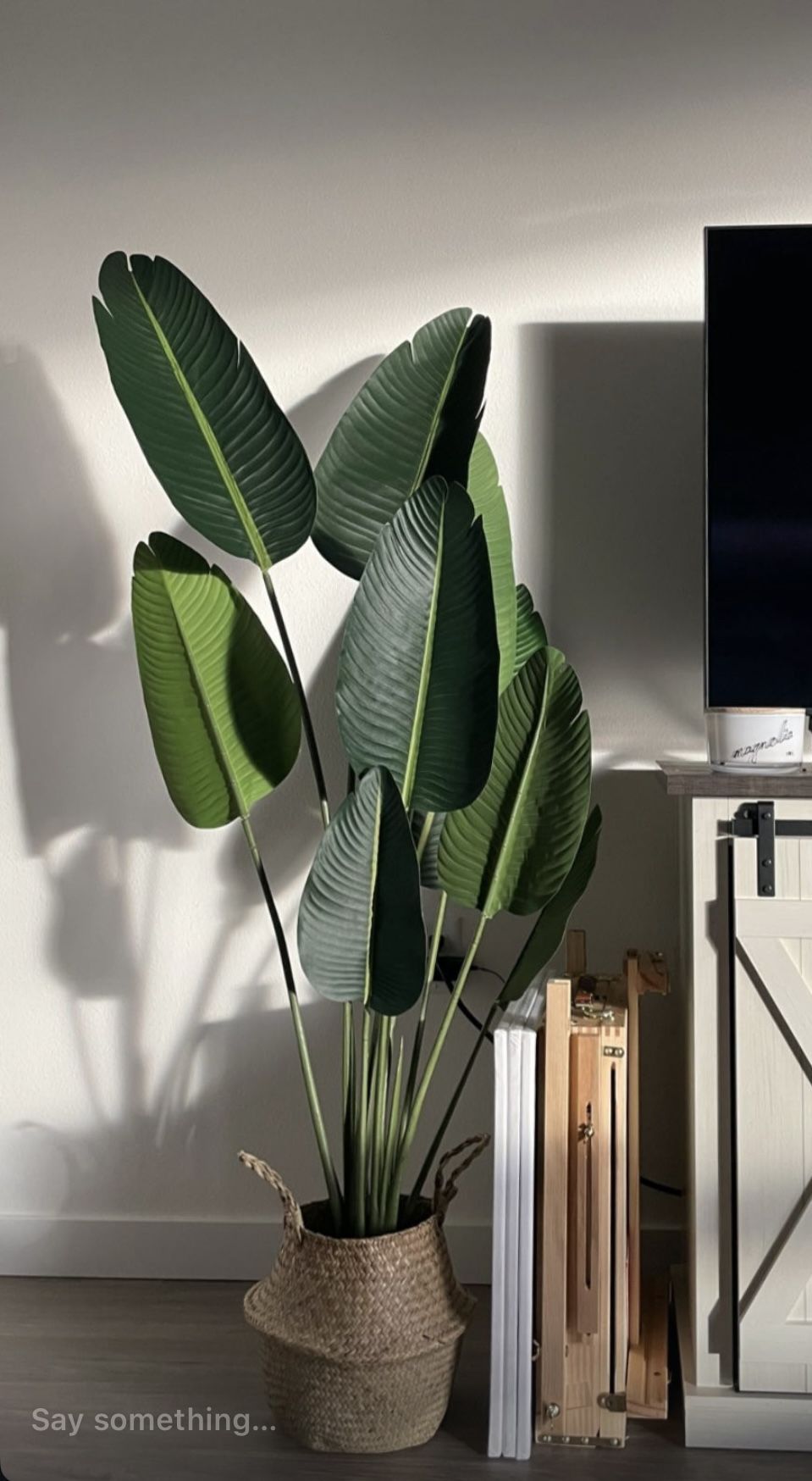 Realistic artificial silk bird of paradise palm tree. Has a 5 foot height. Brand is Bagari. Comes as a potted plant. Brown planter is not included