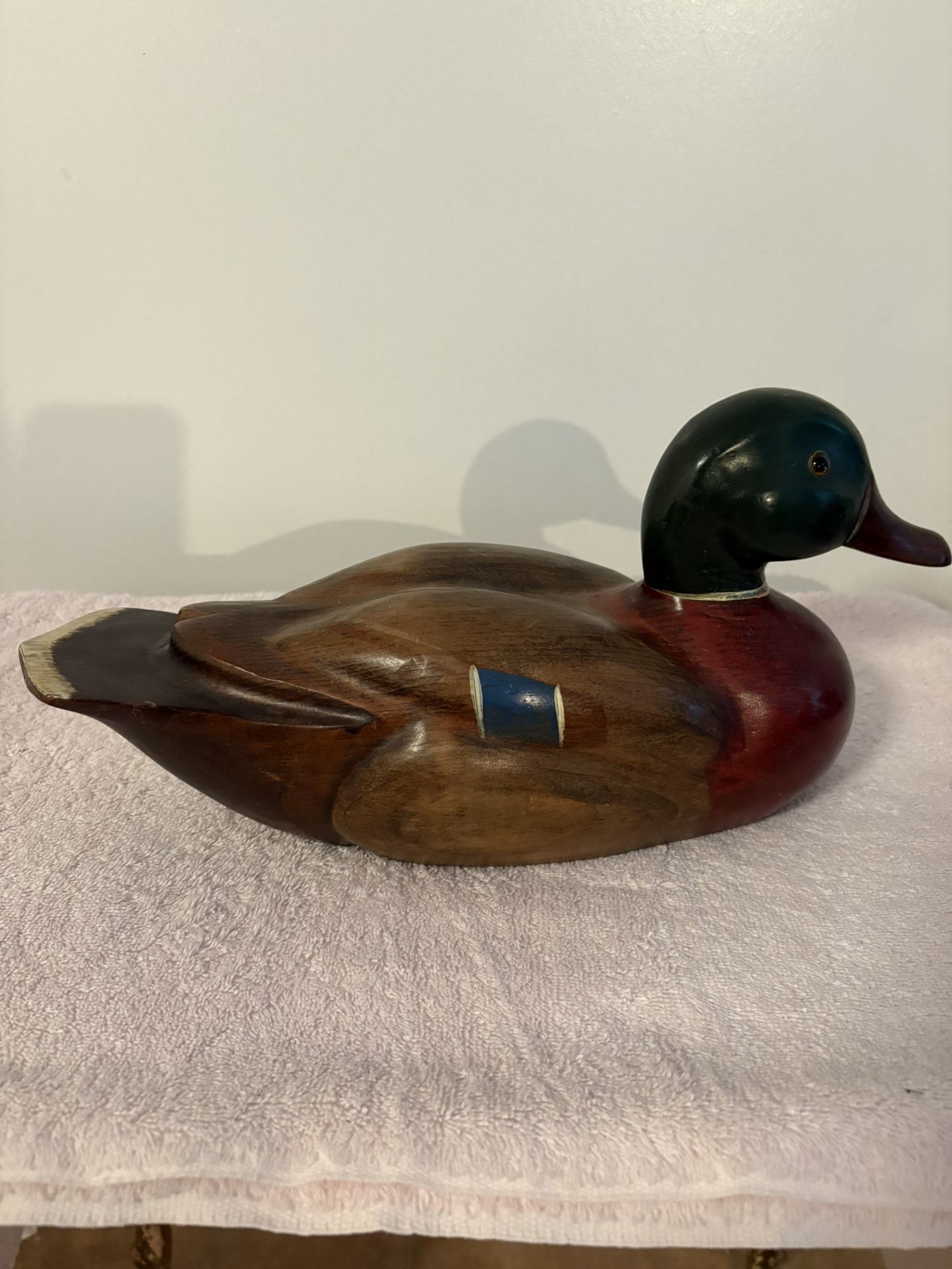 Vintage Mallard Wood Carved Duck Decoy, hand painted glass eyes