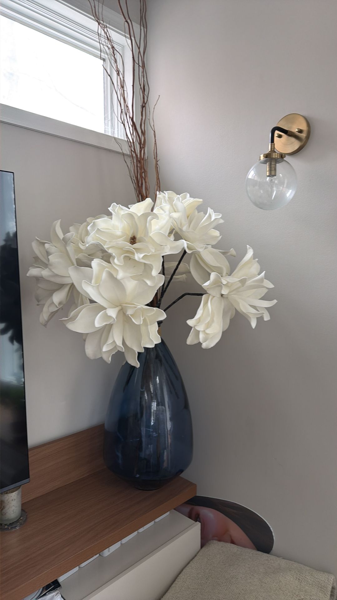 Tall glass vase in blue made in Spain, about 16 pounds. Narrow opening top