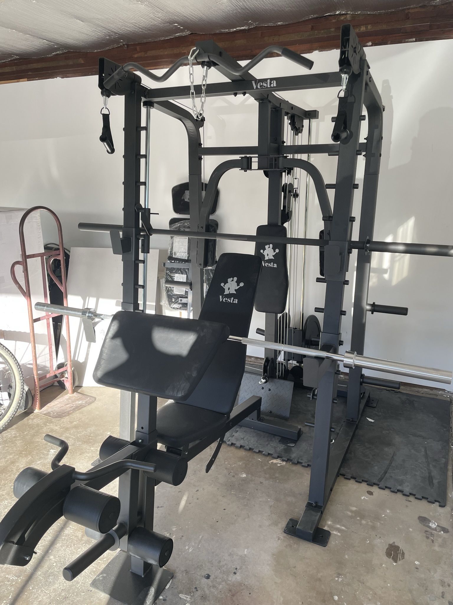 Vesta Fitness Smith Machine 2001 w/Bench Attachment | 230lb Bumpers Weights | 7ft Olympic Bar | Fitness | Gym Equipment | FREE DELIVERY 🚚