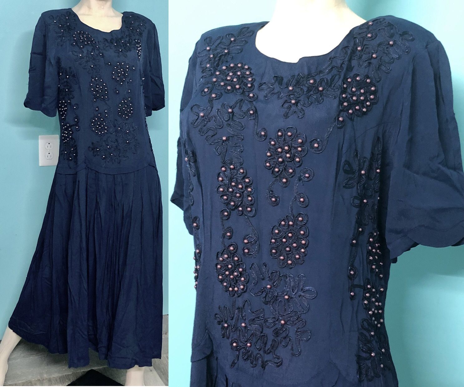 Vintage beaded, short sleeve, flapper style drop waist maxi dress. Gorgeous special occasion, mother of bride dress with pleated sleeves that have scalloped edges, ribbon and bead, embellishment all over the front bodice, and perma-pleated skirt With oversized drop waist. Brand: Sarin NY Size: L Color: navy blue with copper accent. Fiber content: 100% rayon. Stretch: none. Condition: like new vintage Measurements: laying flat, side to side and top to bottom. Armpit to armpit: 22 inches Waist: 19 1/2 inches Hips: 25 inches Across shoulders and back: 17 1/2 inches Sleeve length from nape of the neck: 12 inches Top of shoulder to hem bottom: 50 inches