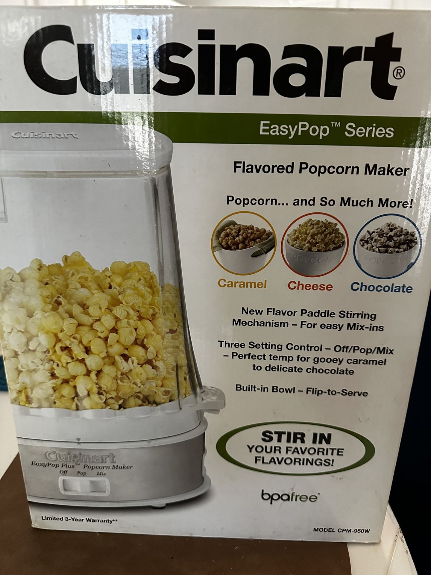 Cuisinart Easy Pop Plus Series Flavored Popcorn Maker Makes up to 10 cups of popcorn Turns off automatically when done Comes with flavor paddle stirring mechanism- for easy mix ins. Asking $10 I’m in Winter Garden near Hamlin Publix.