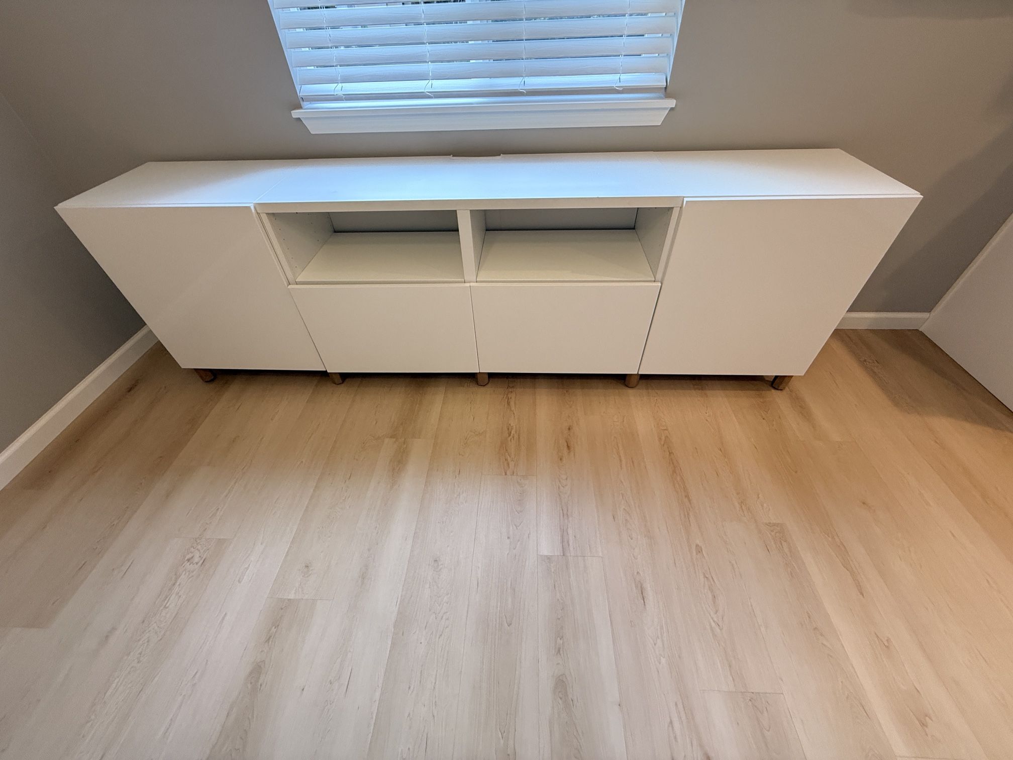 This is the version with wood-effect blades. I have pointed out all the scratches and chips in the photos. Measurements: Width: 94 1/2 " Depth: 16 1/2 " Height: 29 1/8 " Maximum load/drawer: 22 lb Max load/shelf: 44 lb Drawer width (inside): 20 1/8 " Drawer depth (inside): 12 3/4 " Max. TV weight: 35 lb