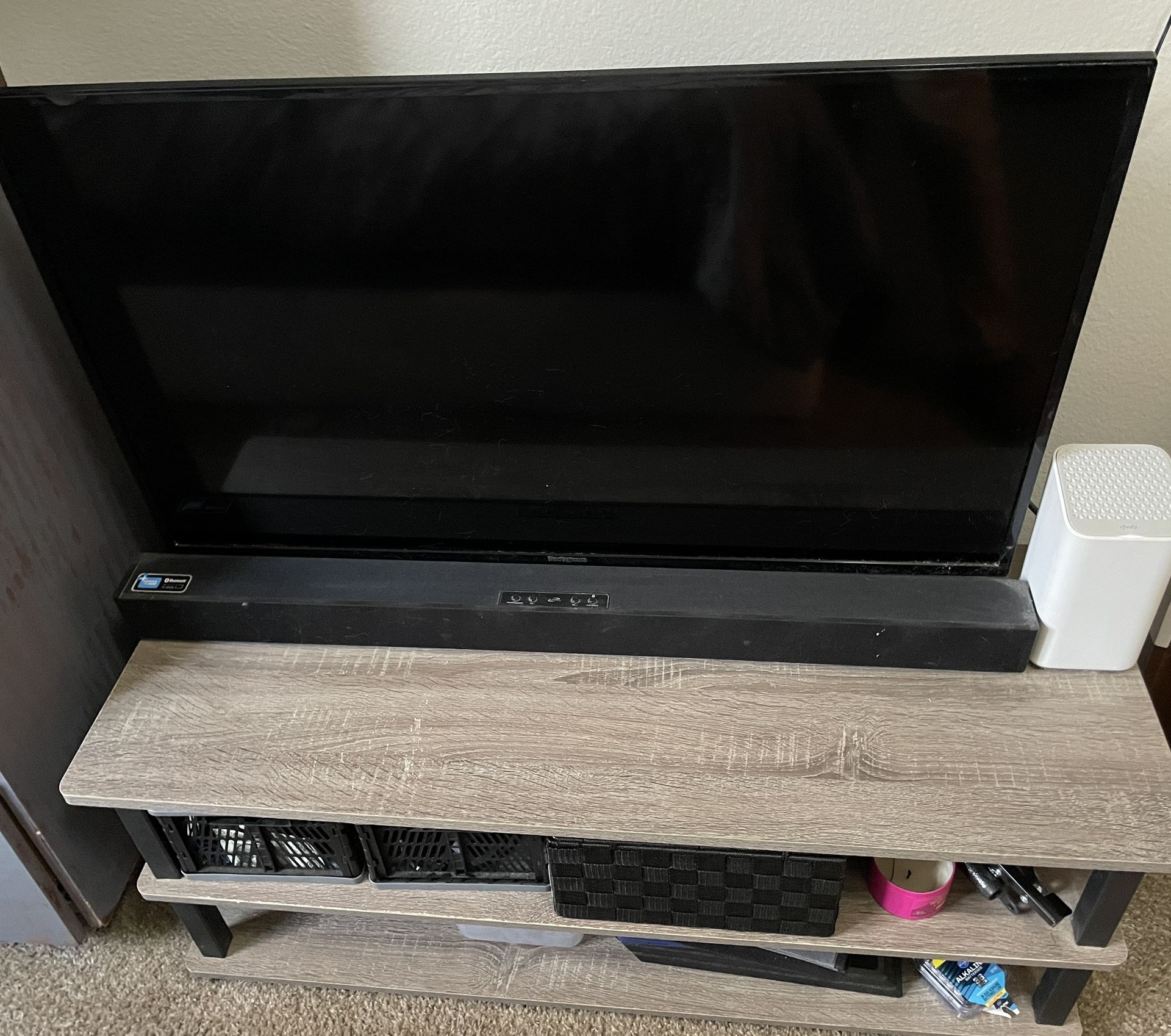 32”tv Westinghouse Ilive sound bar 3 tier grey reclaimed wood tv stand All for $60