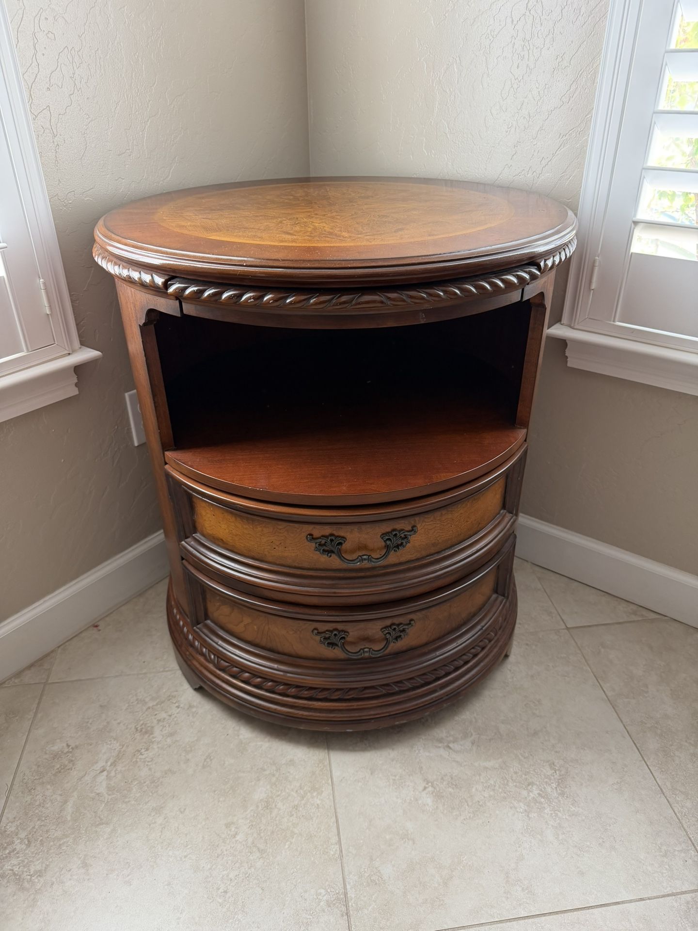Lovely Aspenhome SOLID wood round office printer table! 27 in diameter and 31.25 inch tall. This features two slow close ball bearing storage drawers, integrated hidden outlets and an extending work top. This is in excellent condition.
