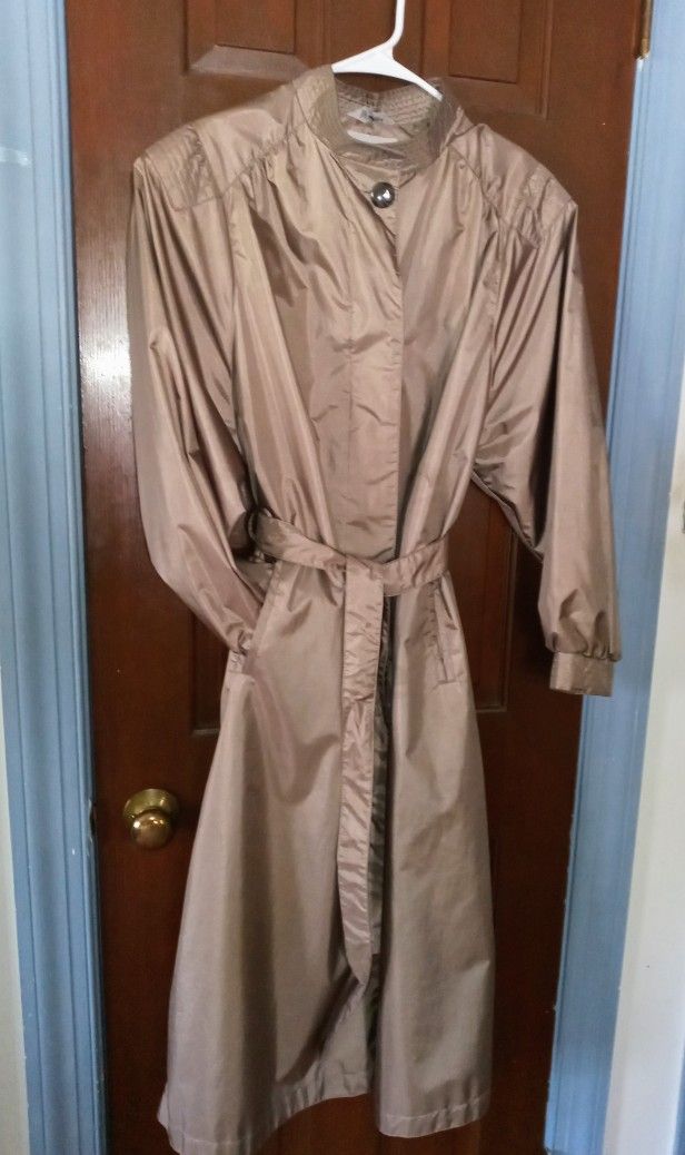 Tis the season for coats like this! Perfect for rainy or windy spring days or those cool Spring / summer nights. Beautiful Windsor Bay rain/wind/over/trench coat in metallic champagne. Size 6 petite ( which means it's cut shorter, not necessarily smaller). but it is a little roomy for a 6. a size 8 woman with breasts that are not too voluptuous can wear this comfortably buttoned. Excellent condition.