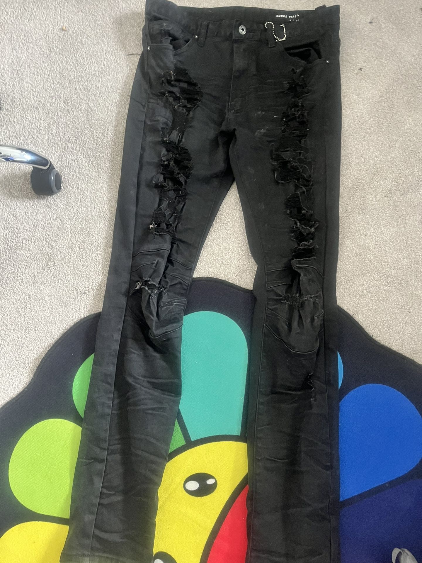 Smoke rise jeans rips Black Distressed Skinny Jeans Sleek black skinny jeans featuring heavy distressing along both legs for a bold, streetwear look. Designed with a tapered fit, subtle fading, and stacked detailing at the knees and ankles. Finished with classic five-pocket styling, belt loops, and a zipper fly. These jeans bring an edgy vibe and pair perfectly with tees, hoodies, or sneakers for a standout fit.