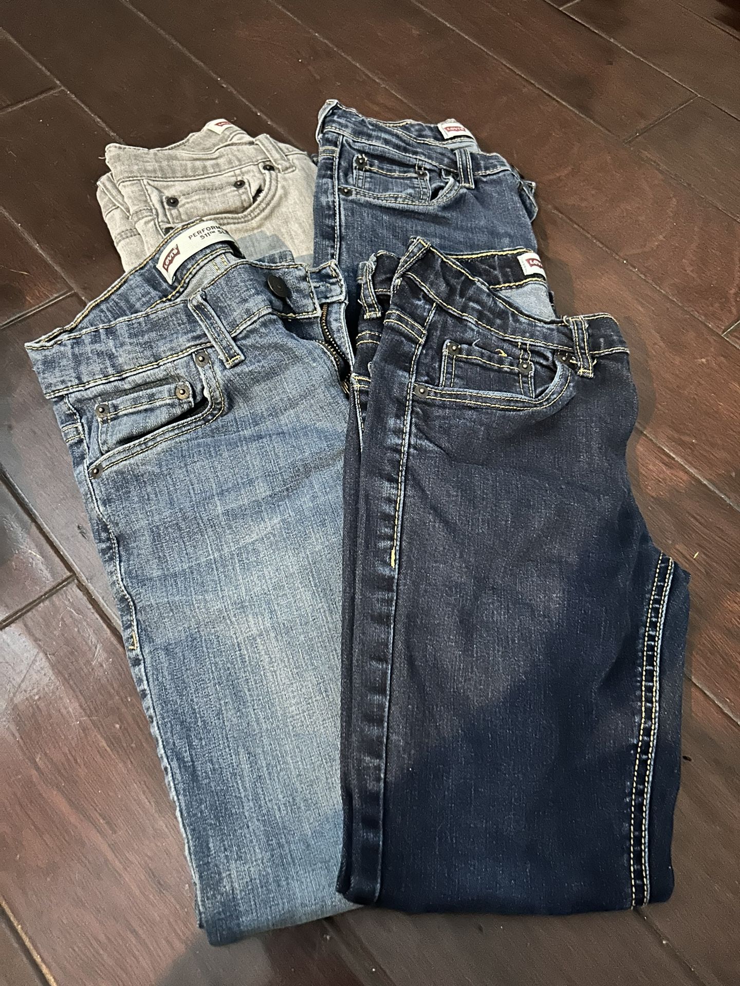 4 pairs. Various shades of blue denim and I light grey size 10 regular $10 each 2 pair size 12 blue $10 each