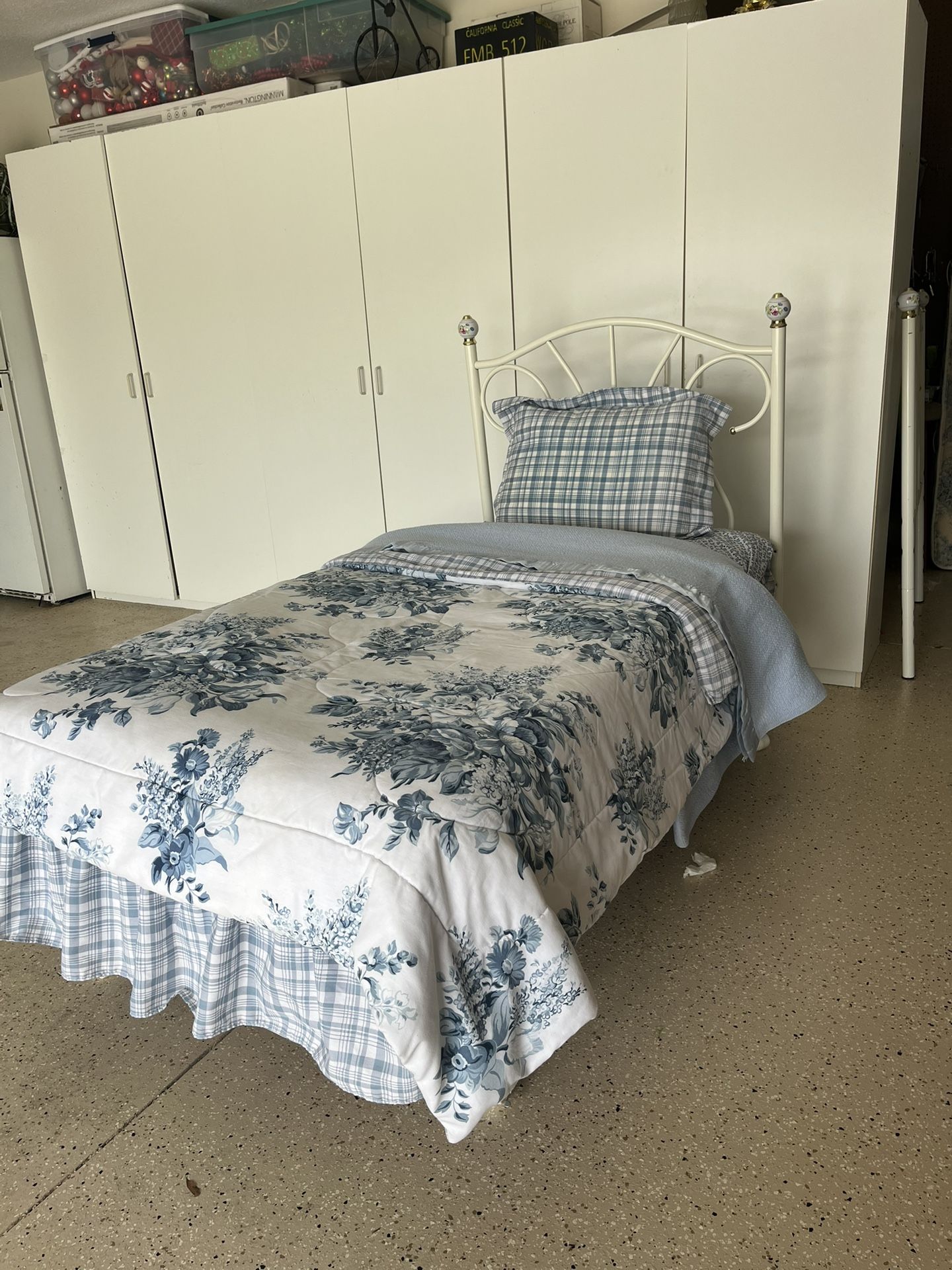 Gently used twin mattresses, box springs, bed frames, white metal headboards complete bedding sets for each of the beds.