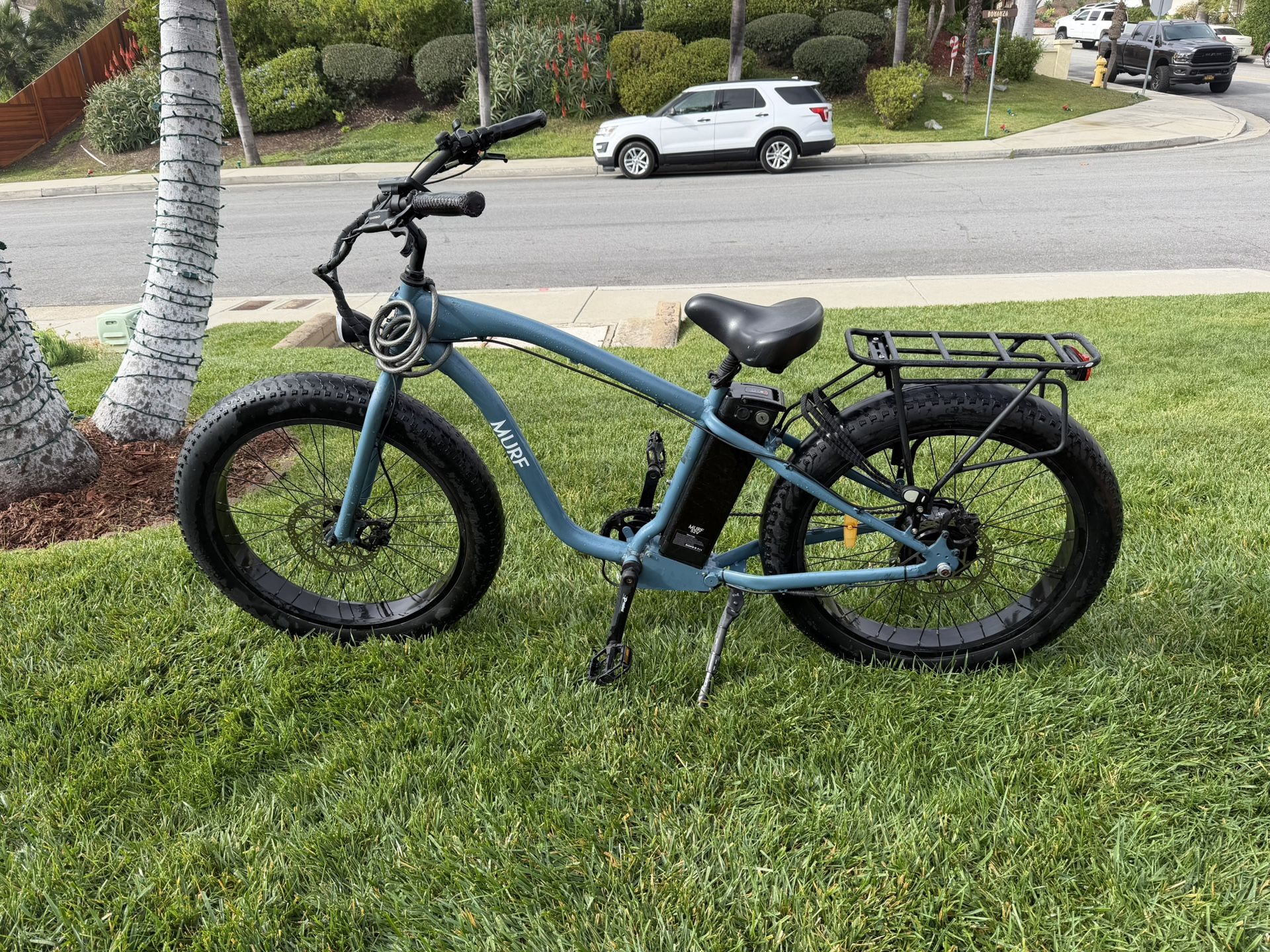 Selling my Murf Class 3 electric bike. This is a powerful, comfortable fat-tire e-bike that goes up to 28 mph and rides great on streets, bike paths, and beach areas. • Class 3 (28 mph) • Fat tires (smooth ride, very stable) • Strong motor & long-range battery • Rear cargo rack included • LCD display • Front & rear disc brakes • Adult size frame (fits most riders) • Approx. 1,540 miles • Clean title-free bike (no issues, no warning Battery holds a good charge, shifts and brakes smoothly. Normal cosmetic wear from use but no damage. Stored indoors. Perfect for commuting, cruising, or replacing a car for short trips.