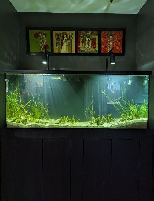 Working freshwater tank. Selling with everything included. Since so many have requested it. Below are dimensions and added photos of plumbing. Tank 18" D x 60" W x 25" H Stand 19.5" D x 65.5" W x 37.5" H Together tank and stand is about 75" high with the overhead lights. The overhead lights are Kessel Sun. They cost about $700 alone. Can include a 34 gallon bowfront feeder tank if requested. Feeder tank is free if you want it. Pickup only. I cannot deliver.