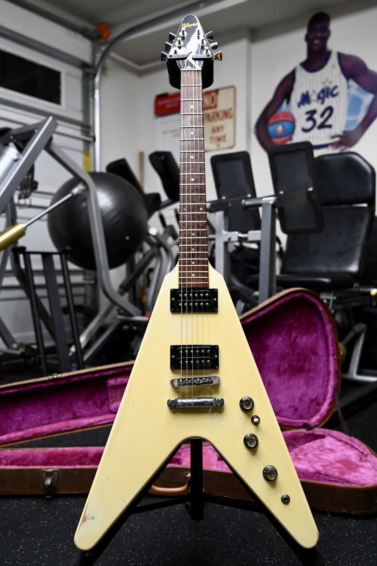 1983 Gibson Flying V '83 Polaris White Very rare color Finish has aged, beautiful checking throughout body and neck. Original Dirty Fingers pickups All parts are original to the guitar 1 11/16” nut width Original Gibson case, original owner put stickers on case and one on front of body Cleaned and polished entire guitar (body, neck, headstock, fretboard. Conditioned fretboard. Setup with StringJoy 10/48 Nickel Wound strings