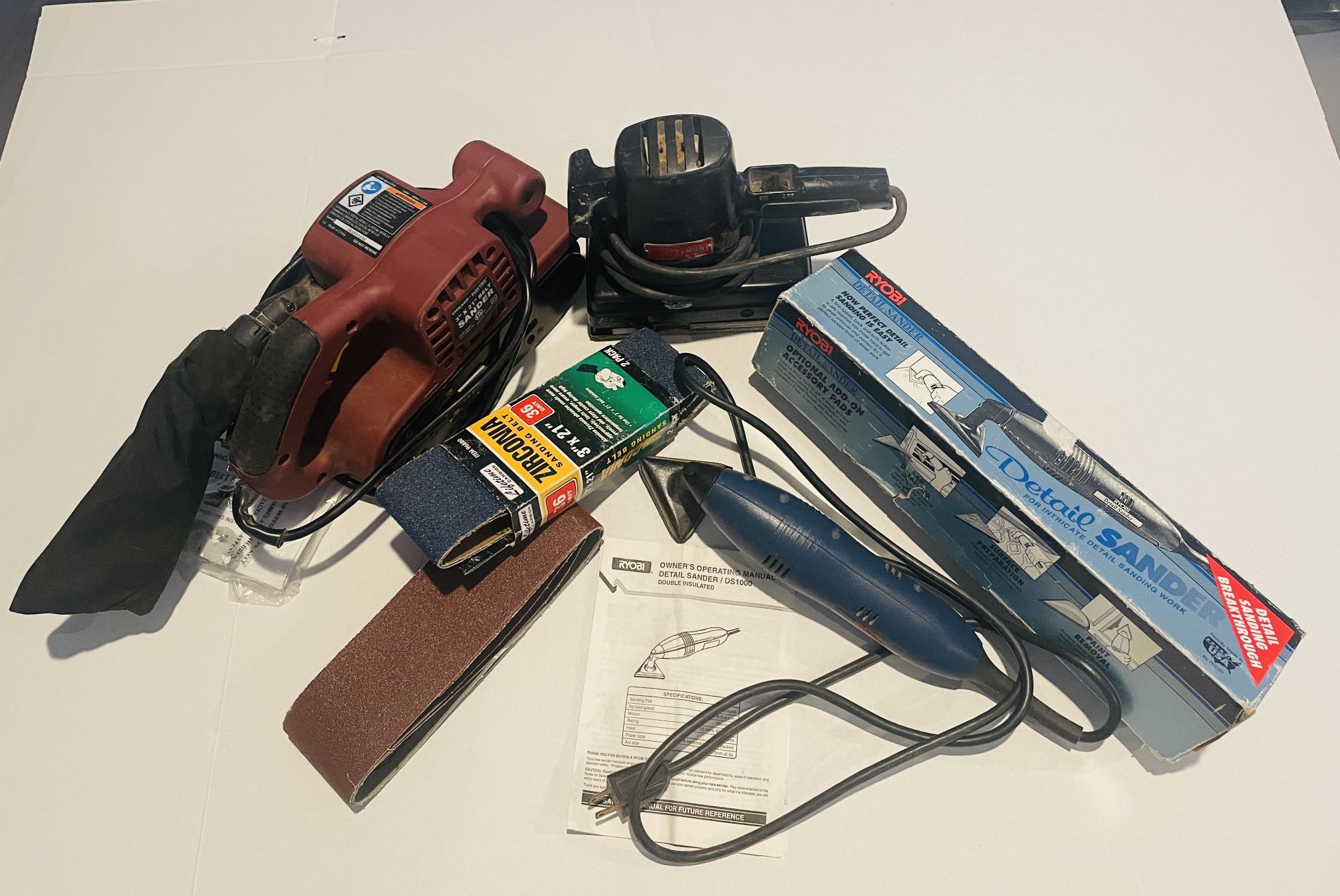 A Chicago Electric 3x21 in Belt Sander, a Craftsman Vibrating Sander, & a Ryobi Detail Sander + some belts & sand paper. Cash only. Thanks for viewing.