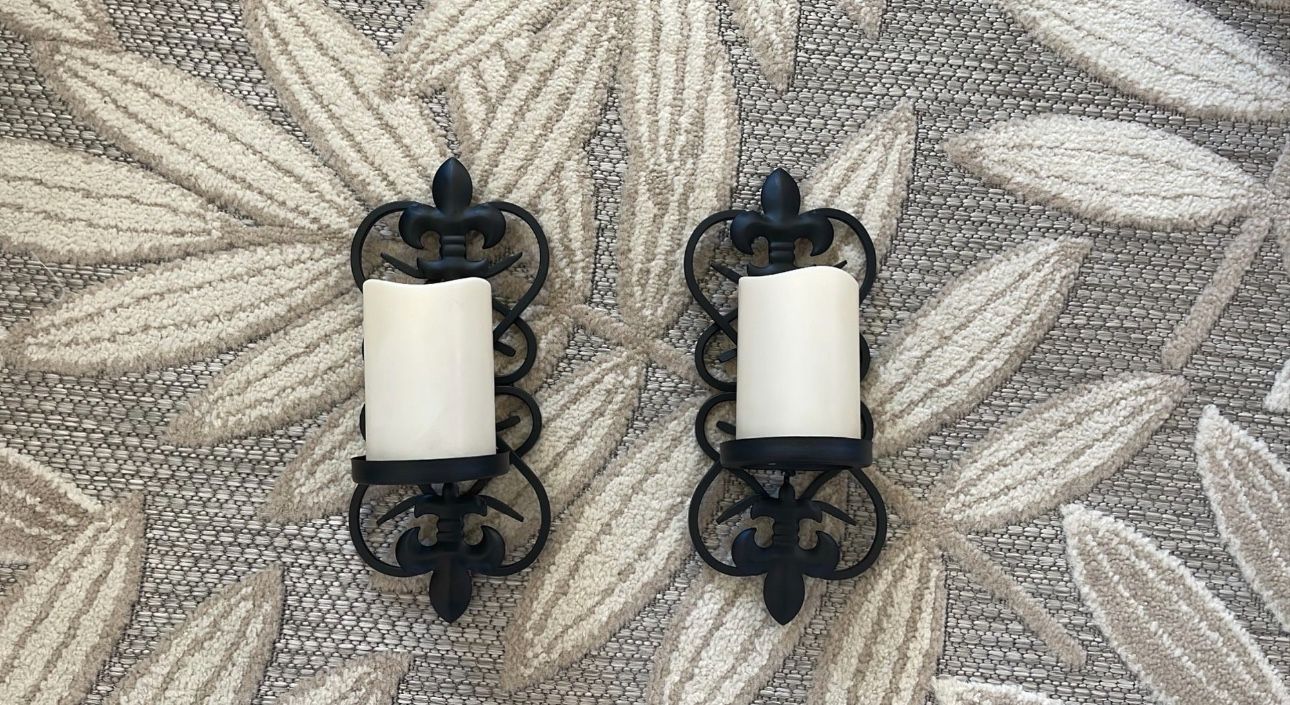 Set of 2 Wrought Iron Wall Candle Holders w/Battery Operated Candles. Batteries included. Pick up in Lake Elsinore.