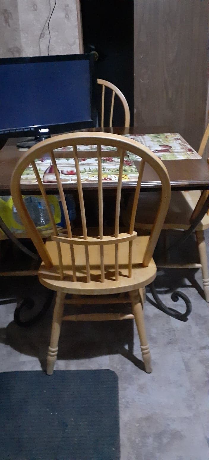 Hello I’m selling our kitchen table no scratches it’s a really nice table chairs are in really good condition stabilizing really good condition the reason I’m selling it because I can’t have it in my trailer is too big for here right now