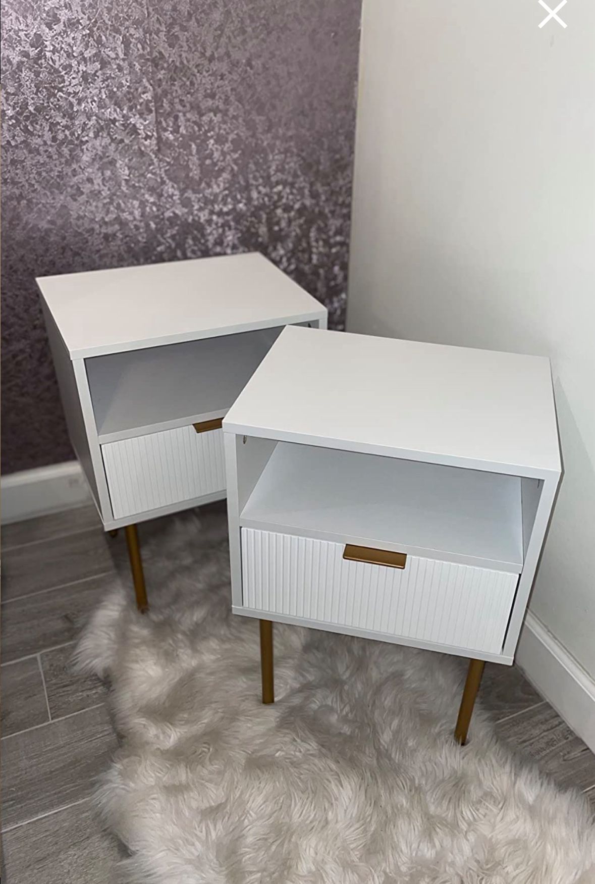 Set Of 2 White And Gold Fluted Drawer Midcentury Modern Nightstand