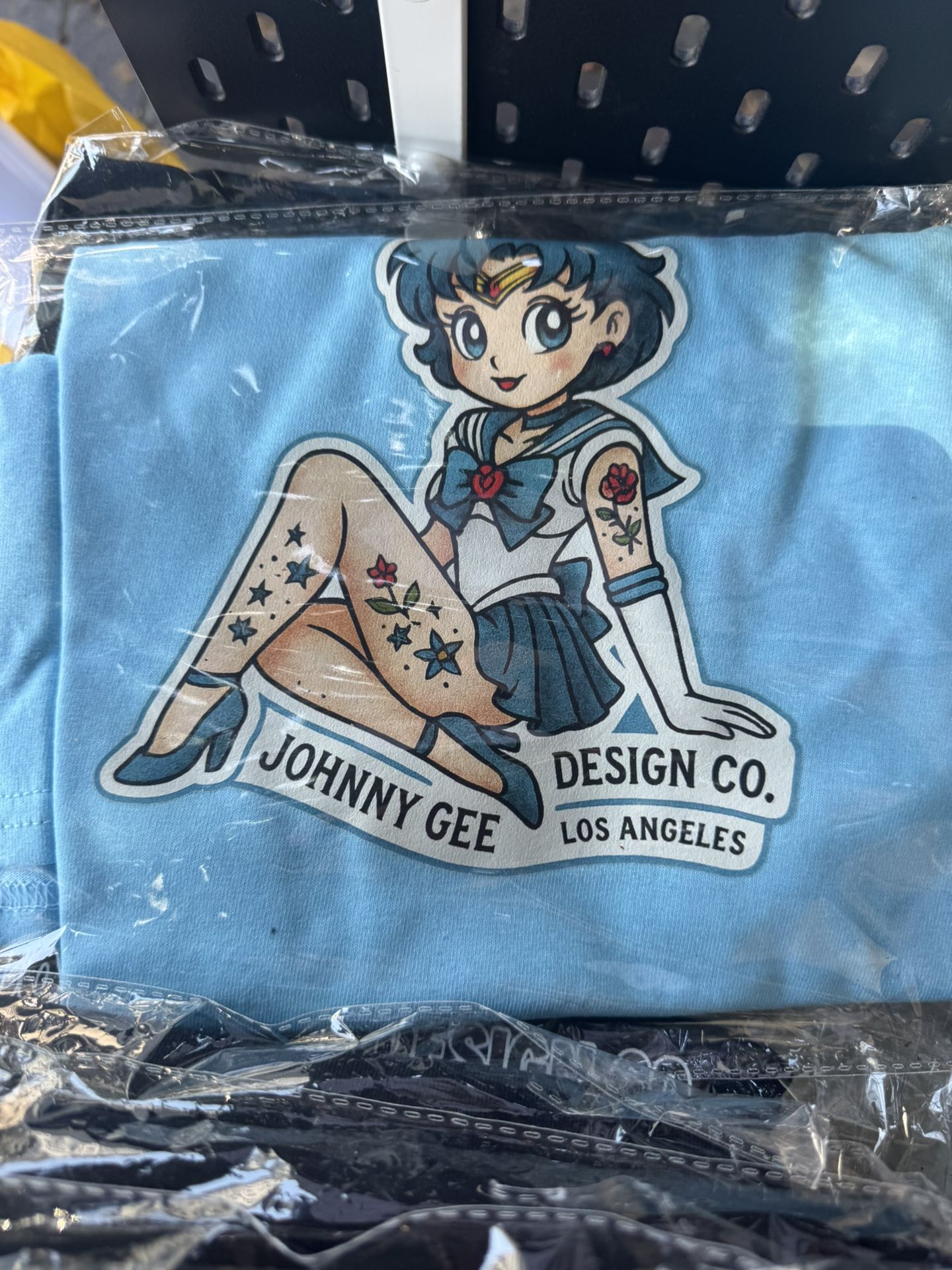 A dreamy collab between vintage tattoo vibes and anime nostalgia. This baby blue tee features our Sailor cutie inked up and ready to fight evil with charm. Printed on soft, heavy cotton and made to last—just like your obsession with magical girls. Designed by Johnny Gee Design Co., straight from Los Angeles. Size: Med (Other sizes available to order!) DM to grab one before it vanishes in a puff of glitter.