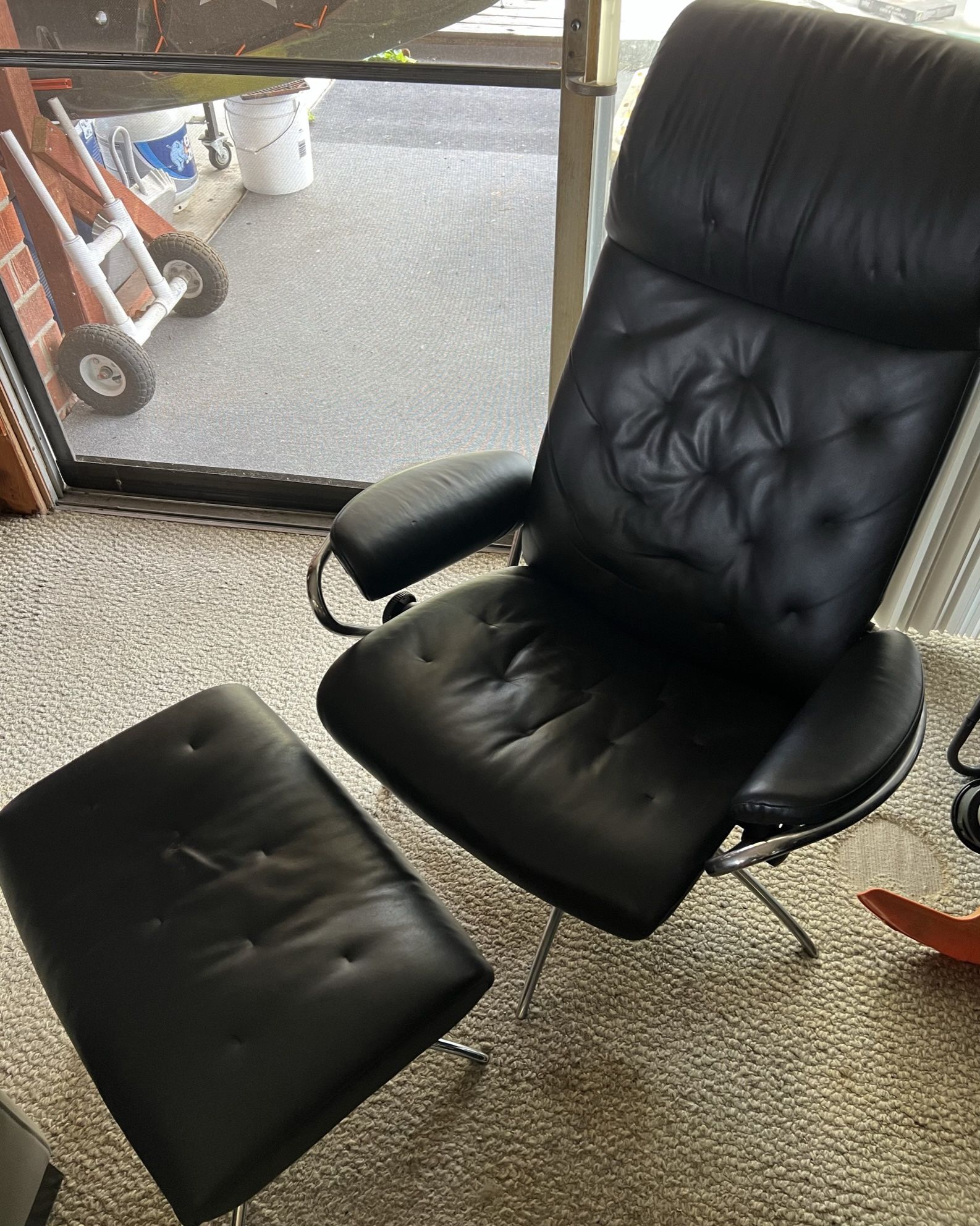 Like new recliner and ottoman. RARELY ever sat in- it’s primarily been in a corner in our front room. Nothing wrong with either item, selling it because we do not have room for this. Very comfortable and the reclining feature is smooth and relaxing. These chairs are beautifully made and sell for $3,000+. General measurements: Back of chair height: 32 inches Back of chair width: 20 inches Seat of chair width: 30 inches