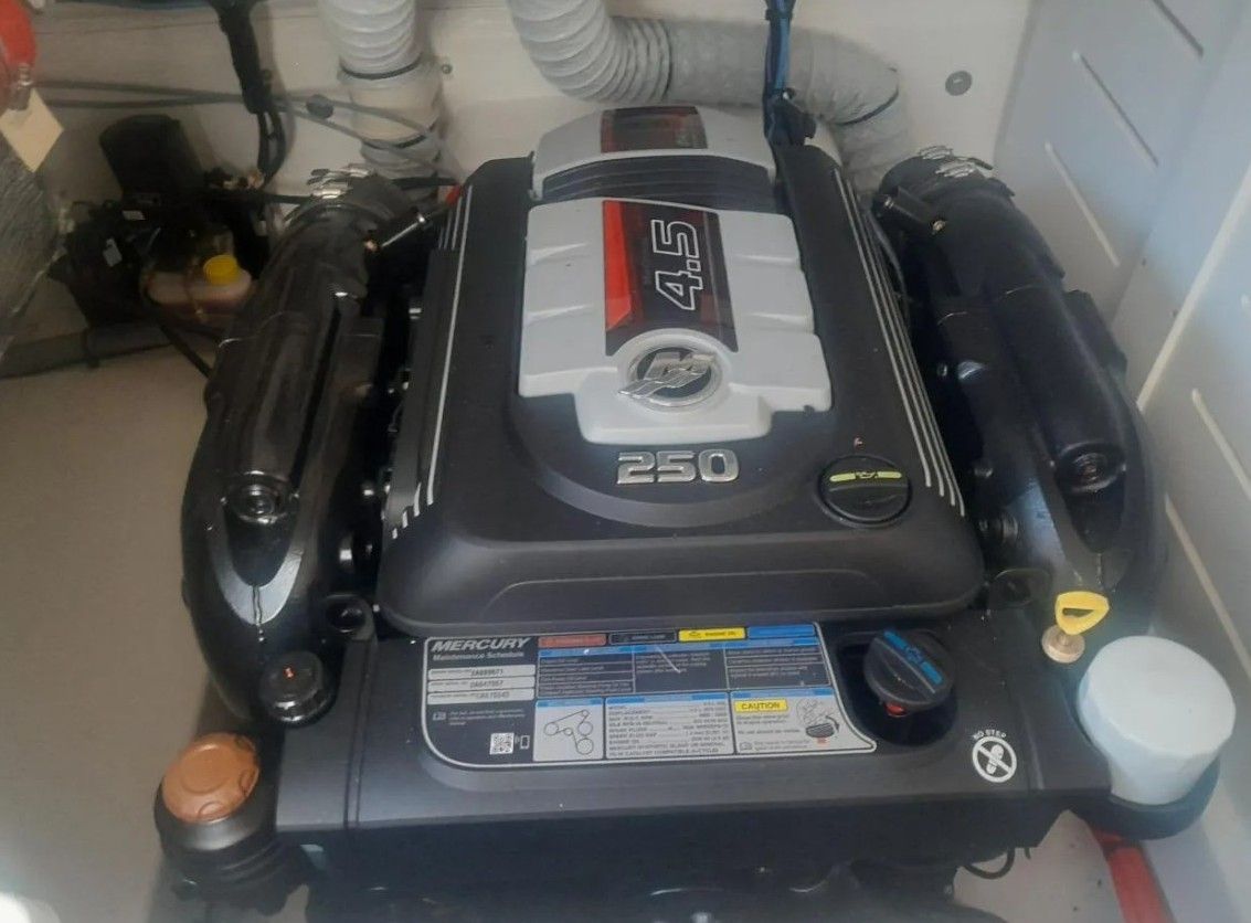 Year of manufacture: 2021. Engine power: 250 HP. 4-stroke outboard motor. Superb Mercruiser engine with the new 4.5L V6 cylinder range. Sold with transom, Simrad control unit, and multifunction display. Gearbox and cables included, 12-month warranty, 46 engine hours.