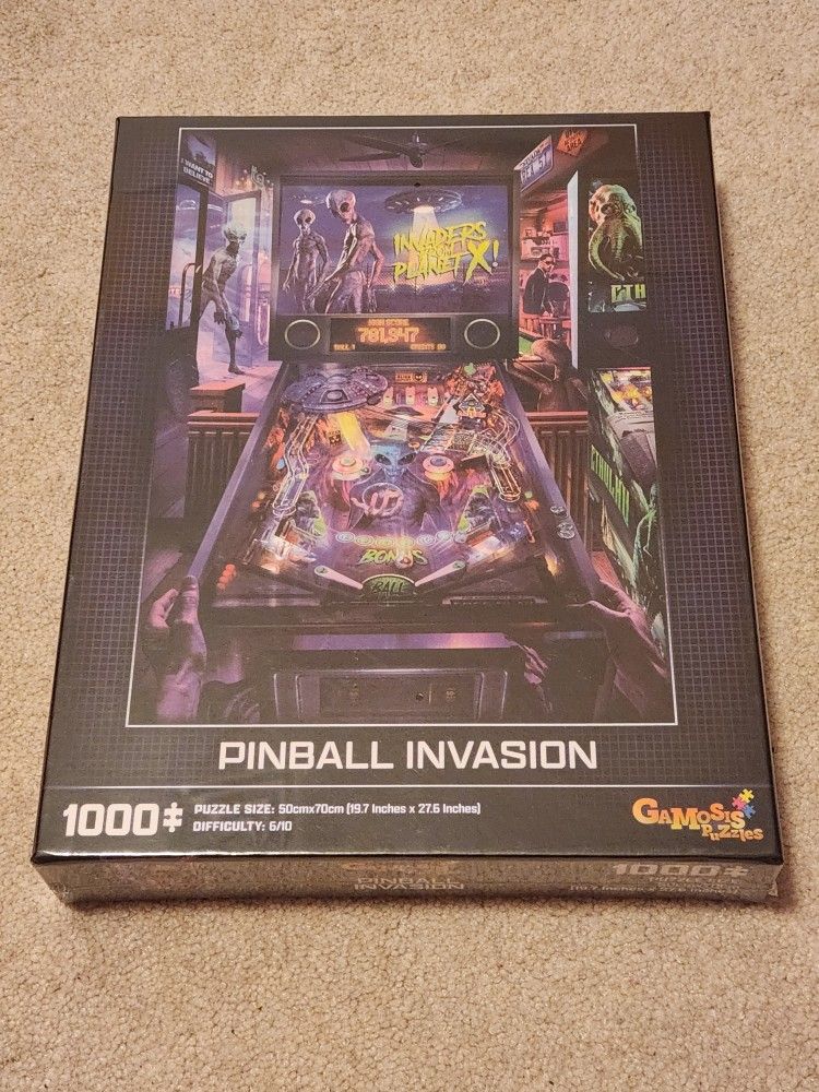 Enjoy hours and hours of entertainment completing this 1000-piece jigsaw puzzle of A Pinball-themed All Things Alien Invasion. The puzzle is brand new, has never been opened, never used. The puzzle measures 27.6" X 19.7" when complete.