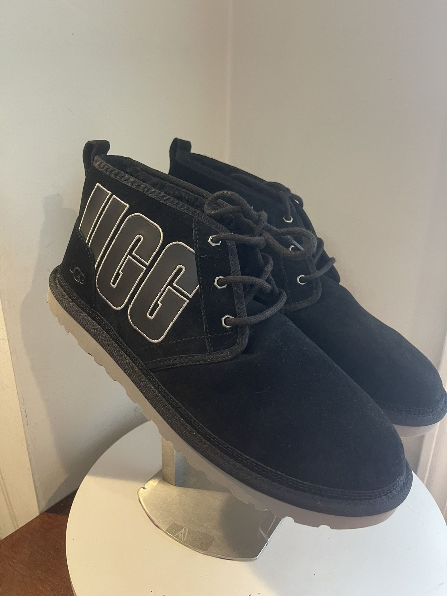 Brand New UGG MEN'S NEUMEL GRAPHIC OUTLINE BOOT - BLACK/GREY SUEDE size 14 The iconic UGG chukka is bolder than ever before! Crafted with rich suede, the UGG Neumel Graphic Outline adds a premium aesthetic to the pre-loved silhouette. The UGGplush lining and sockliner pamper your feet with lasting softness and plush warmth, while the foam footbed offers a cushioned stride. Featuring a lightweight Treadlite by UGG outsole, these boots rep the signature comfort and support of UGG. Finished with a bold heat-embossed UGG logo on the upper, the UGG Neumel Graphic Outline brings attention to your feet. Textile binding made from 100% recycled polyester fibers enhances durability. 17 mm UGGplush lining and sockliner: 80% upcycled wool / 20% lyocell. Metal eyelets and cotton laces help secure the fit. Embroidered UGG logo reps the brand. Rear pull tab makes slipping in and out of these UGGs quick and easy. PICK UP TINTON FALLS NEW JERSEY OR SHIPPING AVAILABLE TO ALL STATES PAYMENTS ACCEPTED Offer up , Cash, CashApp, Zelle & Venmo Thank you