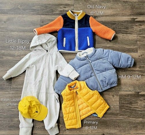 Mixed bundle total 5 items Sizes and brands in photos Open to individual offers as follows: Old Navy Jacket: $7 HM Coat: $12 Primary Vest: $7 Little Bipsy Jumpsuit: $3 (knee blemish, but great for playground clothes!) Polo Hat: $9